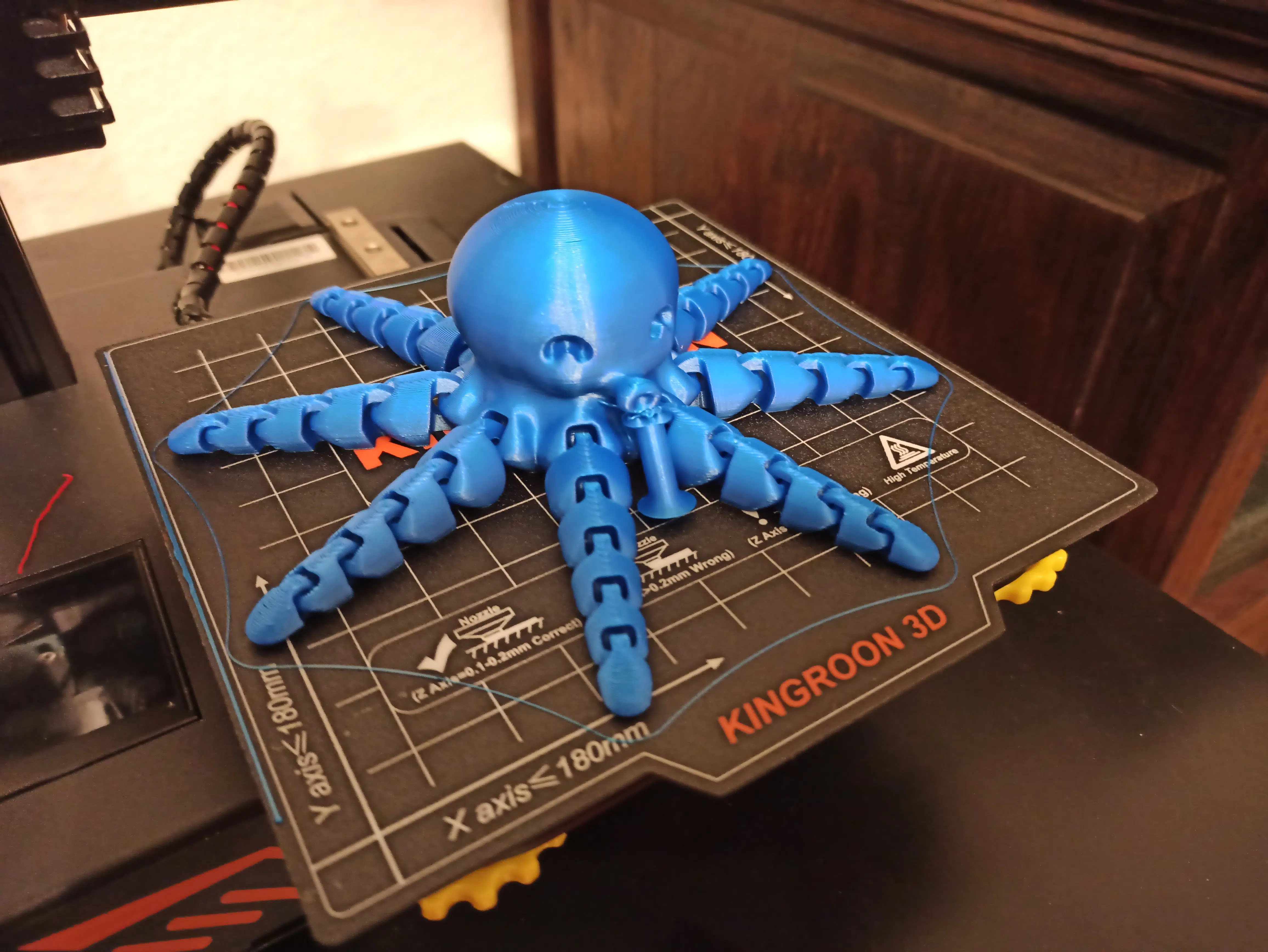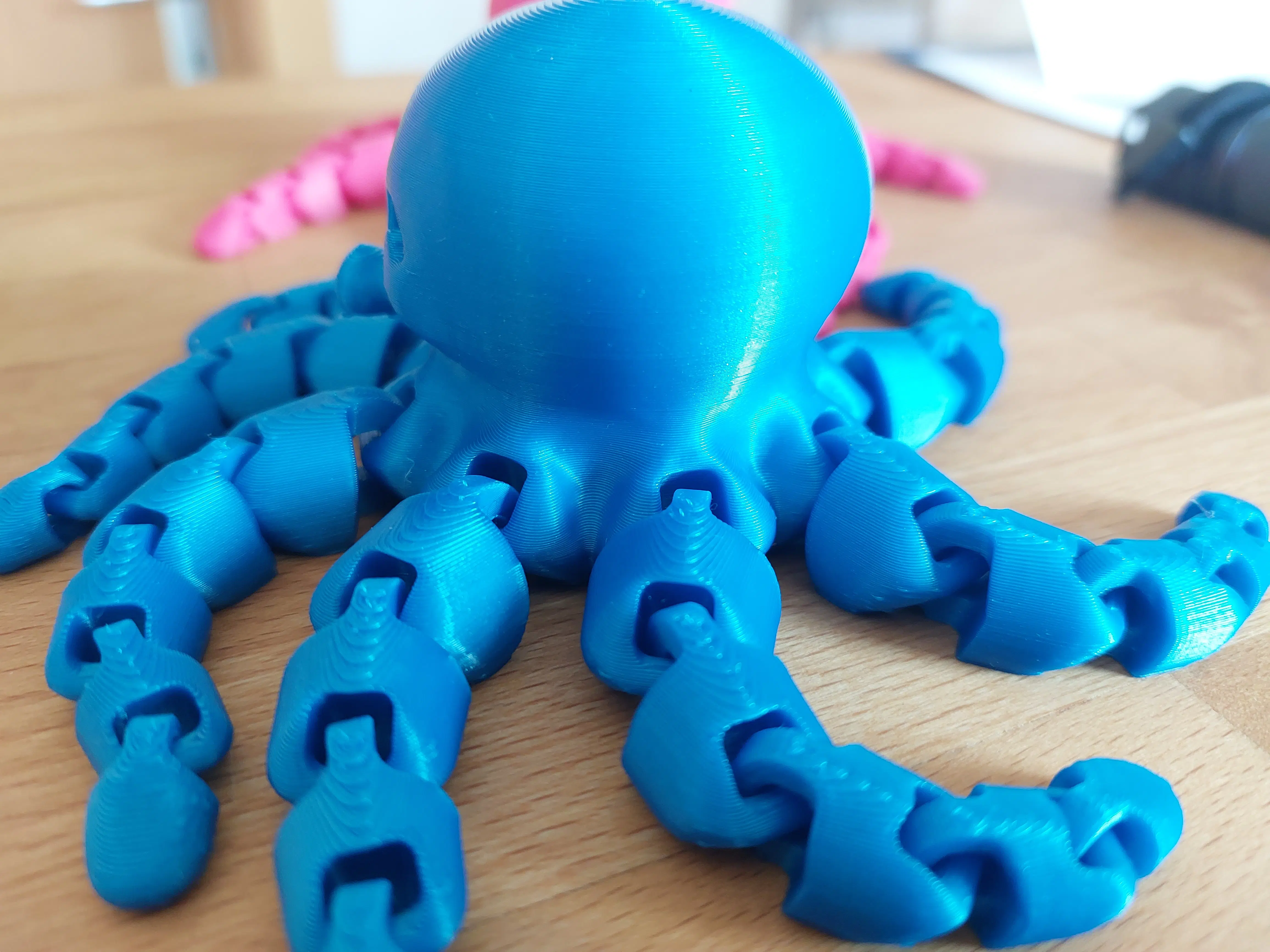 Zum Spaß habe ich auch nochmal den beliebten Oktopus druckbettfüllend gedruckt. Der ist wirklich sehr gut geworden. Alle Gelenke waren direkt ohne jede Einschränkung beweglich und das Druckbild insgesamt sehr gut. Vielleicht verschafft das ein besseres Bild über die Druckqualität, anstatt nur auf die Schwächen bei den Härtetests zu schauen.