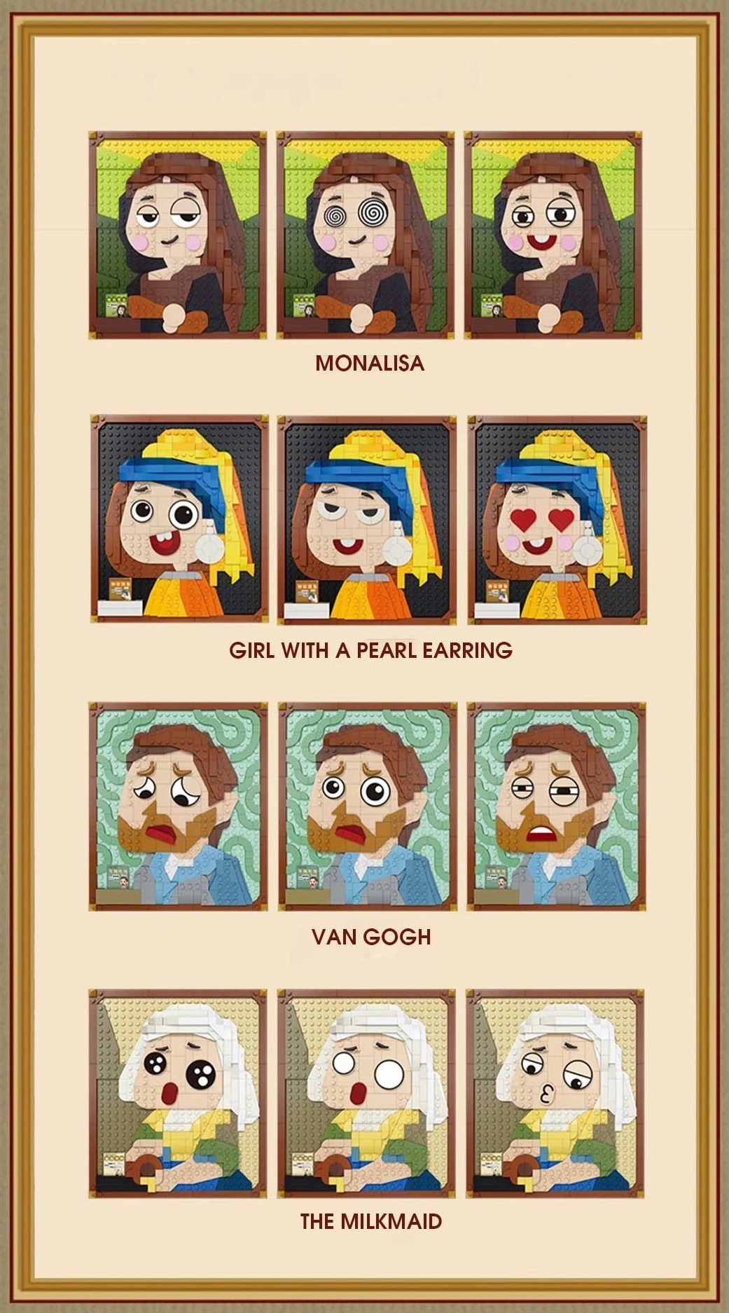 Was kann man aus Klemmbausteinen nicht alles Kreatives basteln. Zum Beispiel Klassiker der Kunstgeschichte wie die Mona Lisa oder das Mädchen mit dem Perlenohring in, äh, „ausgefallenem“ Comic-Look mit austauschbaren Gesichtsausdrücken.