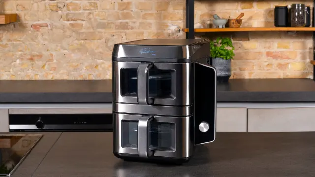 Die Bedienung erfolgt über ein zentrales Touch-Display an der Seite, das mit verschiedenen vordefinierten Programmen für Fleisch, Fisch, Gemüse oder sogar Backwaren daherkommt. Wer es lieber individuell mag, kann Temperatur und Zeit natürlich auch komplett manuell regeln. Die Körbe sind beschichtet und können anschließend zur Reinigung in die Spülmaschine.