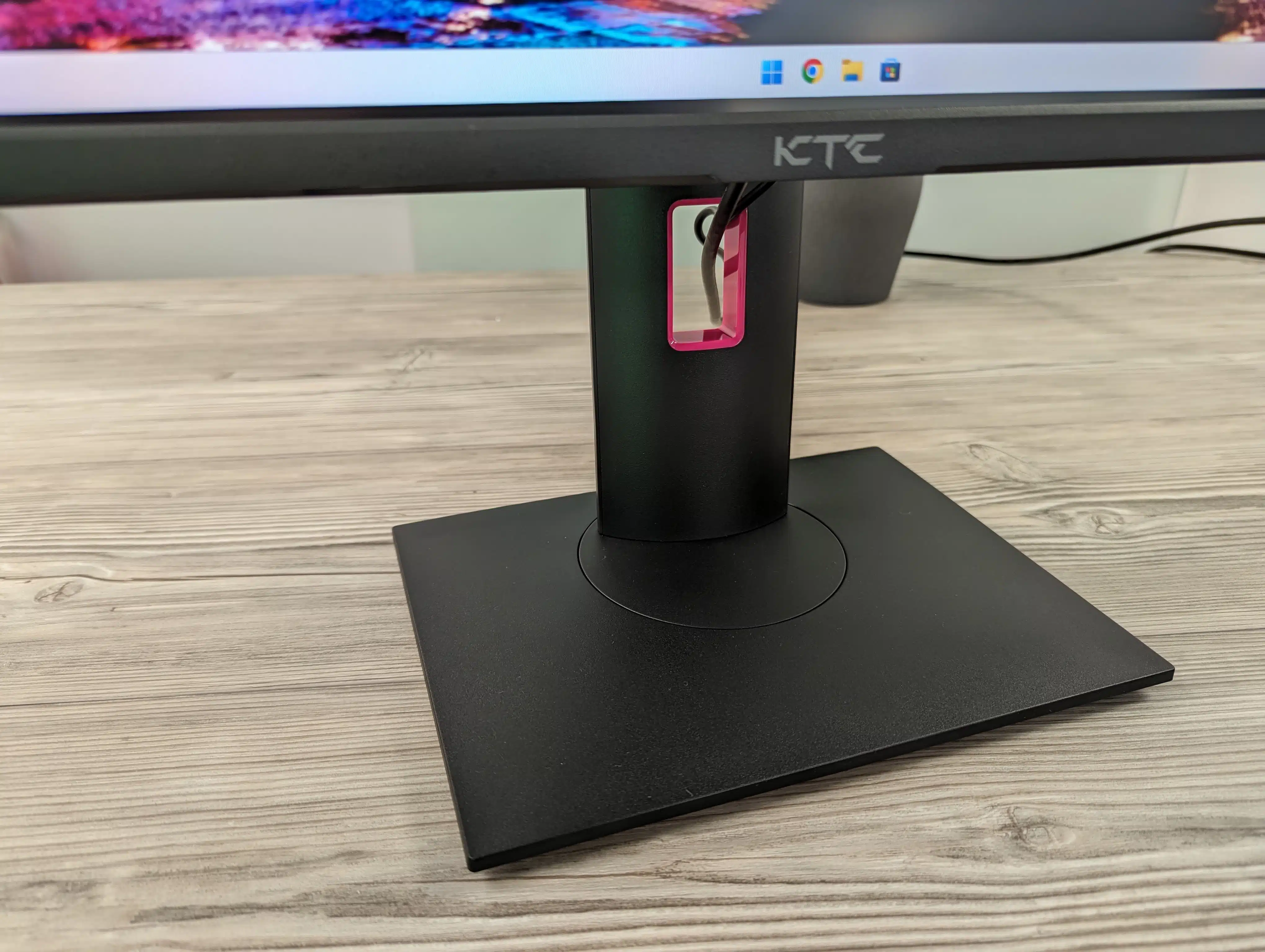 Mithilfe des Standfußes kann man den Monitor neigen, drehen und in der Höhe verstellen. In der Halterung befindet sich eine Öffnung, womit man zumindest ein wenig Kabelmanagement betreiben kann.