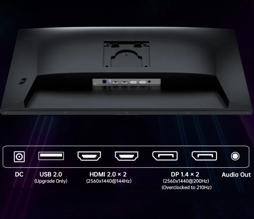 Wer den Monitor lieber an die Wand oder einen eigenen Arm hängen will, kann das dank der VESA 100 x 100 Aufnahme problemlos tun. An Anschlüssen stehen euch zwei HDMI 2.0 Ports und zwei DisplayPort 1.4 Anschlüsse zur Verfügung, dazu gibt es noch einen Audio-Ausgang. Wichtig ist hier eigentlich nur zu wissen: Wer die vollen 210 Hz will, muss zwingend den DisplayPort nutzen. Jedes Gerät, das diese Hz-Zahl befeuern kann, sollte diesen Anschluss aber ohnehin haben.