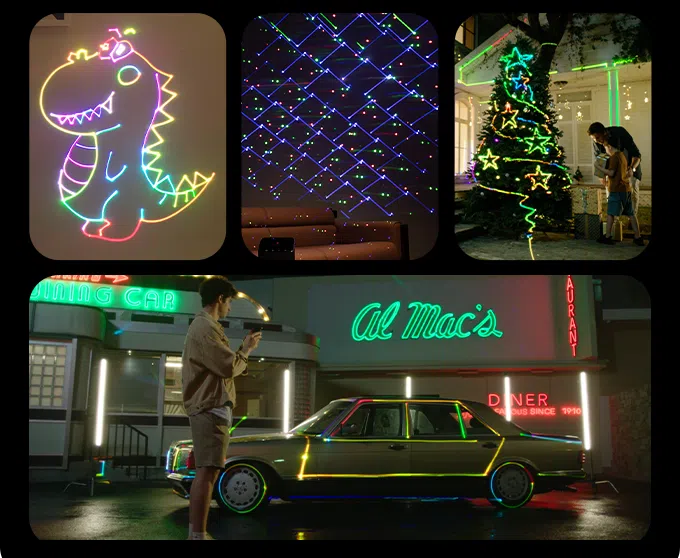 Der Gedanke dabei: Der Projektor ist einfach eingepackt und schnell aufgestellt. Dank des Akkus sollen bis zu 4 Stunden Licht-Show möglich sein. Hier gibt es dann mehrere Möglichkeiten, ein Bild darzustellen. Per App kann man einen kurzen Text schreiben oder ein Bild malen. Es lassen sich auch Fotos aufnehmen und in Zeichnungen umwandeln.