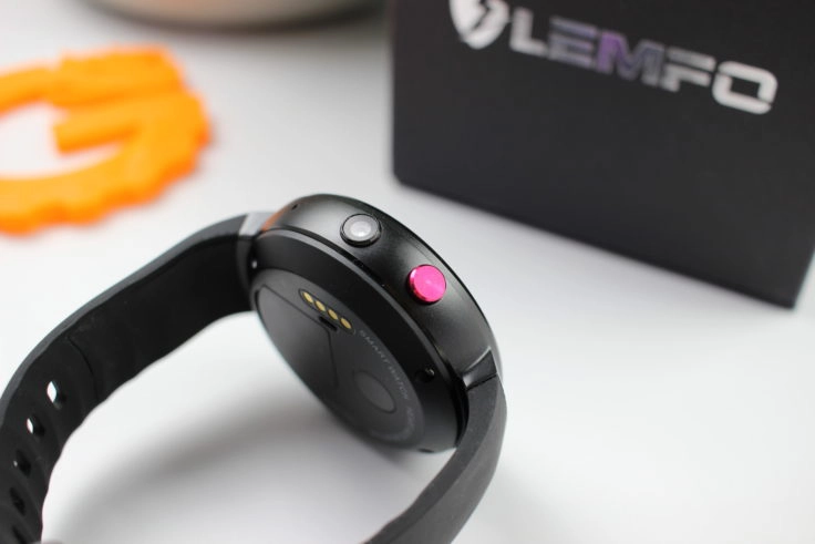 Die LEM7 kommt in zwei Farben: einem eher schlichten Silber-Schwarz und in einem Schwarz mit rot-metallischen Akzenten. Die ganze Smartwatch wirkt wie eine „normale“ Armbanduhr, schließlich ist das Design rund und nicht quadratisch wie beispielsweise die Amazfit Bip. Auf der Unterseite befindet sich der magnetische Pin-Connector zum Aufladen, der SIM-Slot und der Pulsmesser. An der Seite befindet sich eine Funktionstaste und eine 2 Megapixel Kamera – das kennen wir bereits von der Zeblaze Thor Pro.