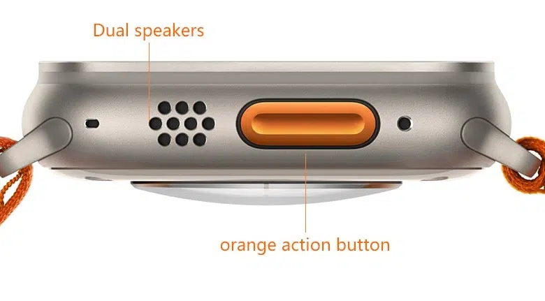 Mit der Apple Watch Ultra kommt ein relativ radikales Redesign der seit der Apple Watch 4 ziemlich identisch aussehenden Smartwatch. Mit 49 mm Diagonale deutlich größer, eine größere Krone, die nun geschützt wird, und eine zusätzliche Funktionstaste. Und genau diese Neuerungen setzt auch die LEMFO WS8 Plus um. Die Krone an der rechten Seite sollte etwas größer sein und ist zusätzlich nicht mehr freistehend, damit sie z.B. beim Klettern nirgends hängen bleibt. An der linken Seite sitzen zudem der neue Action Button, eine zusätzliche Funktionstaste, und die Dual-Speaker.