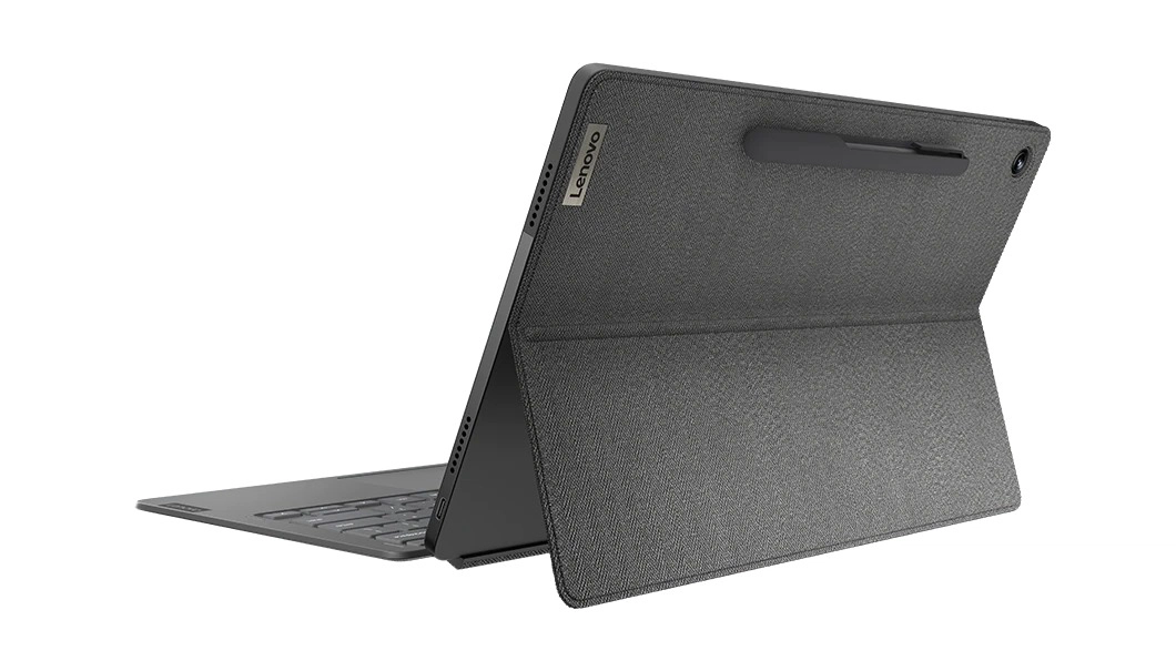 Im Gegenzug zum Vorgänger schraubt man die Außengestaltung zurück und ersetzt das hellblaue Designelement durch ein mattschwarzes. Aber auch eine dunkelblaue Farbvariation namens „Abyss Blue“ ist erhältlich. Bei den Displayrändern wird das Lenovo IdeaPad Duet 5 keinen Preis gewinnen, dafür findet aber eine 5 MP 1080p Frontkamera ihren Platz in diesen. Mit im Lieferumfang dabei ist auch wieder eine Folio-Tastatur im QWERTZ-Layout, welche auch einen Kickstand auf der Rückseite eingebaut hat. So wird das Duet 5 im Handumdrehen zum Notebook. Es ist noch nicht ganz sicher, aber durch die vorhandene Halterung an der Rückseite wahrscheinlich, dass diesmal sogar ein Stylus direkt mit dabei liegt.