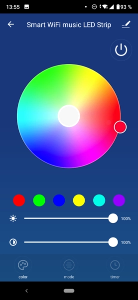 Das Umschalten der Farben über die App funktioniert recht schnell, rein subjektiv sogar schneller als mit der Yeelight App und entsprechendem Strip. Interessanterweise funktioniert auch der Music Mode in diesem Fall einigermaßen okay. Man kann die Sensibilität ganz einfach per Regler einstellen und schon ändert der Strip bei jeglichem Geräusch seine Farbe. Das reicht dann auf höchster Stufe schon alleine mit den Fingernägeln auf den Tisch zu tippen. Der Yeelight Strip hat zwar auch einen Music Mode, aber im Grunde genommen ist es einfach nur ein Lichtfluss, der je nach Musikrichtung schneller oder langsamer durchläuft.