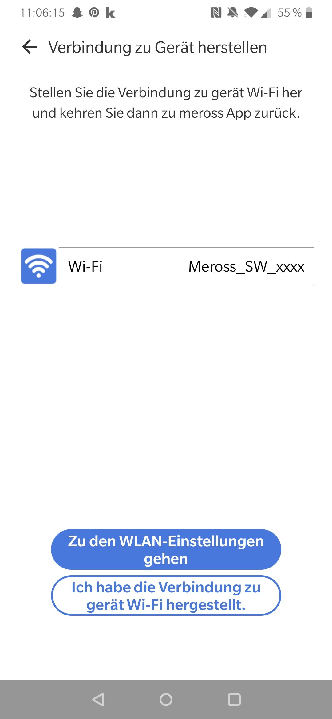 Danach folgt die Einrichtung, welche wirklich gut gemacht ist und selbst für Neulinge im Smart Home keine große Hürde seien sollte. Man kann entweder über die Nachricht „Möchten sie ein Gerät jetzt installieren?“ oder über das + oben rechts in der Ecke die Steckdose hinzufügen. Im Anschluss kann man seinen Gerätetyp wählen, in der App wird die WiFi-Steckdose als „Smart Plug“ kategorisiert. Danach soll man sich mit dem zugehörigen „Meross_SW_xxx“ WLAN verbinden und ist nach kurzer Wartezeit verbunden.