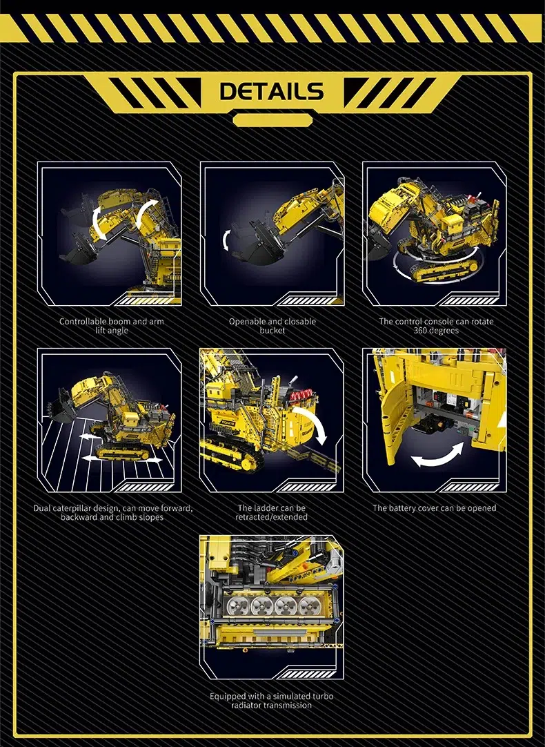 Daneben braucht das große Modell natürlich auch Platz. Fertig aufgebaut werden Maße von 65,7 x 30,4 x 40 cm angegeben. Je nach Positionierung des Arms ist der Bagger sogar noch größer. Das bringt uns zu den vielen beweglichen Teilen des Modells. Mit insgesamt sechs Motoren lassen sich die Ketten des Fahrzeugs und der gewaltige Arm mit der breiten Schaufel bewegen.