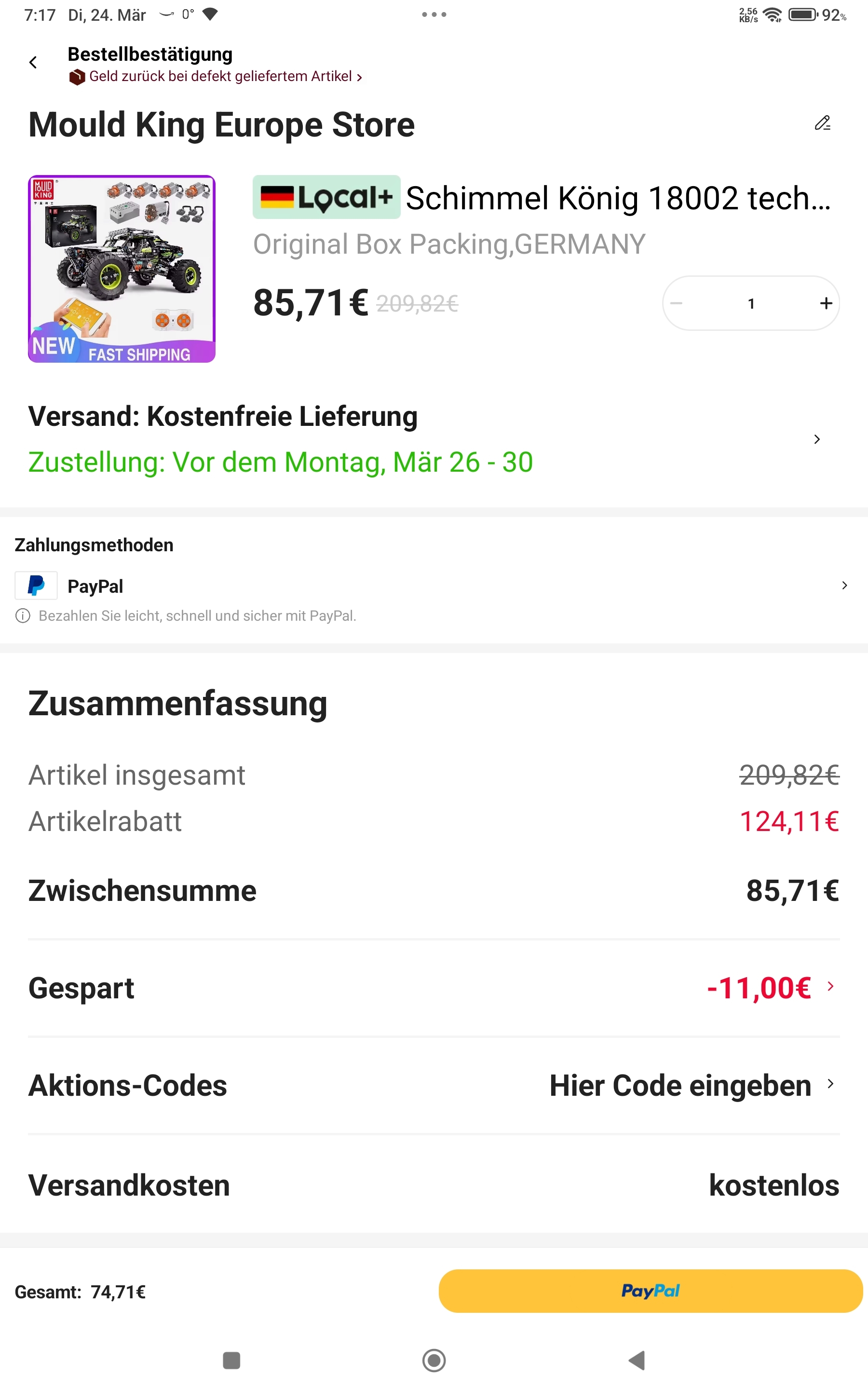 Habe den Artikel gerade erst endeckt. Heute 24. März wird der Buggy mit 85,87€angeboten. Der Rabattcode GADGETS11 funktioniert nich und bringt nochmal 11 Euro Abzu Alles in allem also 74,71€. Bin kein Neukunde bei Ali und habe schon öfters dort Mould King bestellt. War bisher immer sehr zufrieden mit den Modellen von MK.