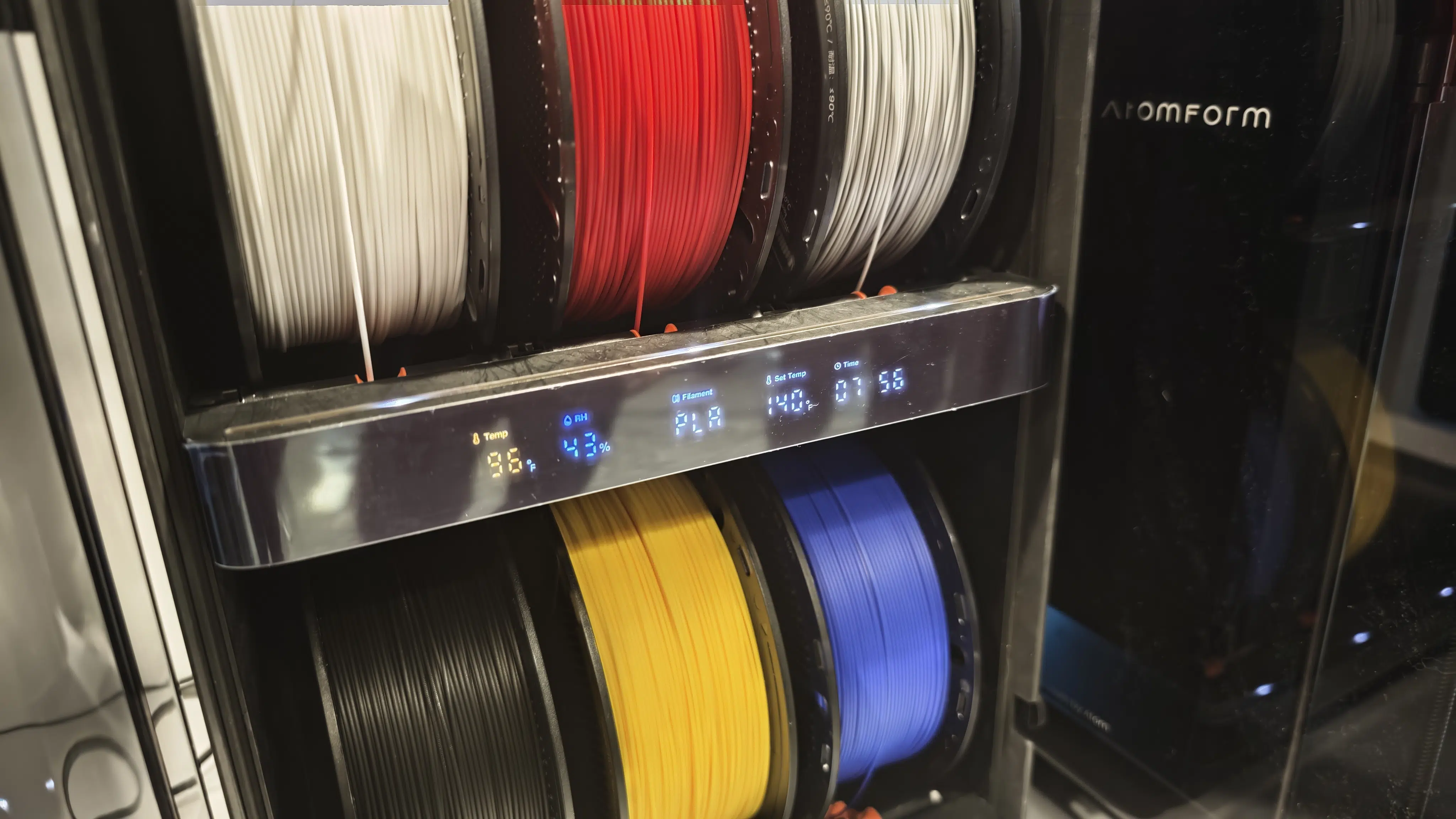 Passend zum Drucker gibt es das RFID-6 System. Dabei handelt es sich um eine Box für sechs Spulen, die optisch stark an Ankers eingestampfte v6-Engine erinnert. Diese kann das Filament aktiv bei bis zu 85°C trocknen und fördern.