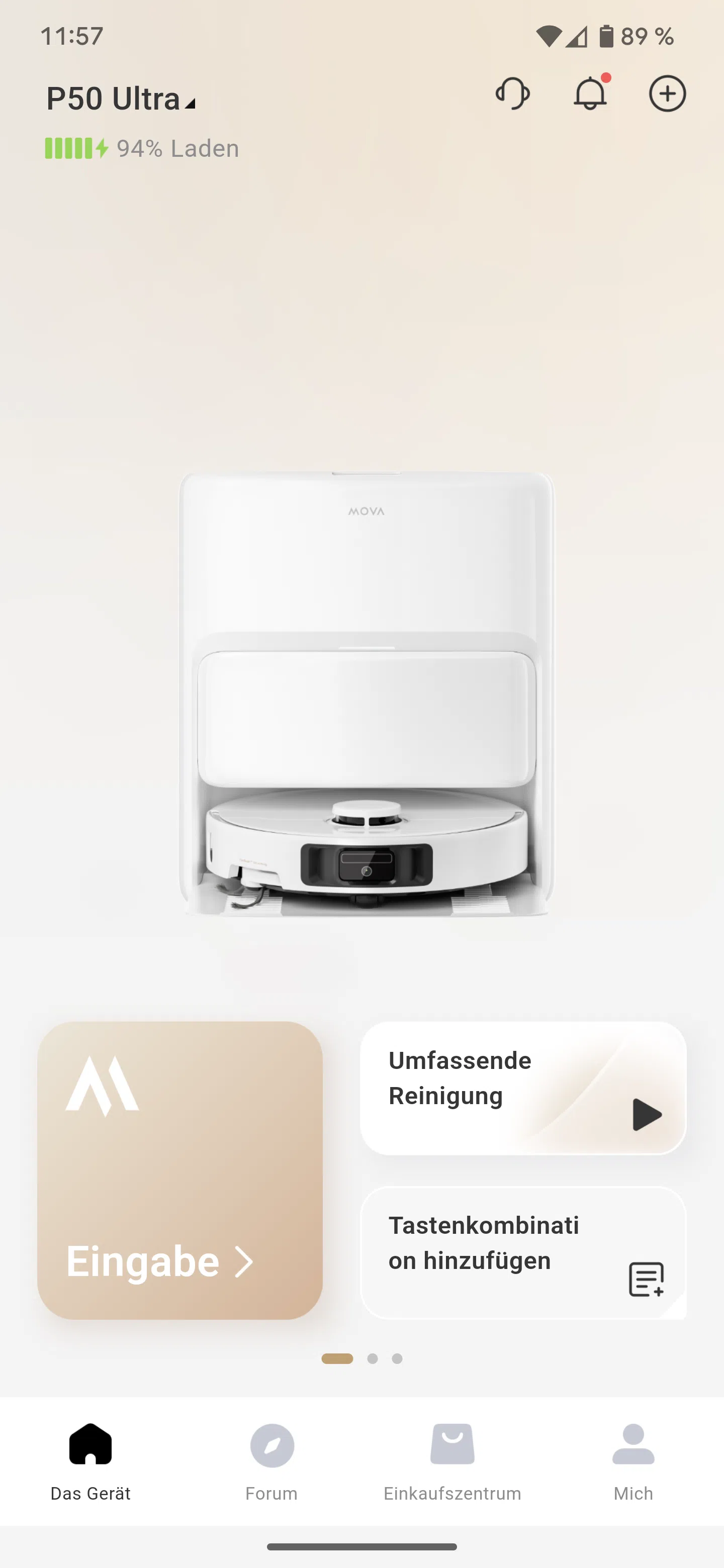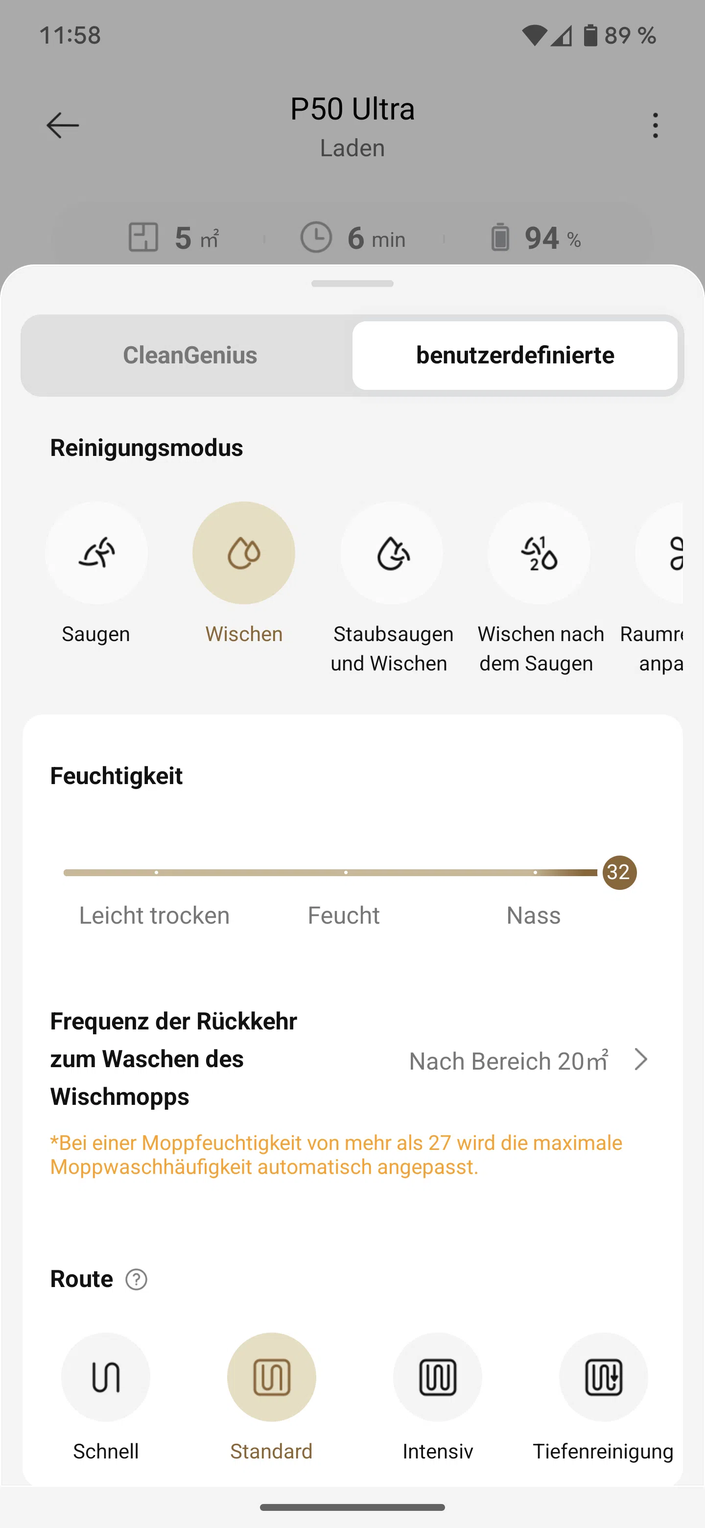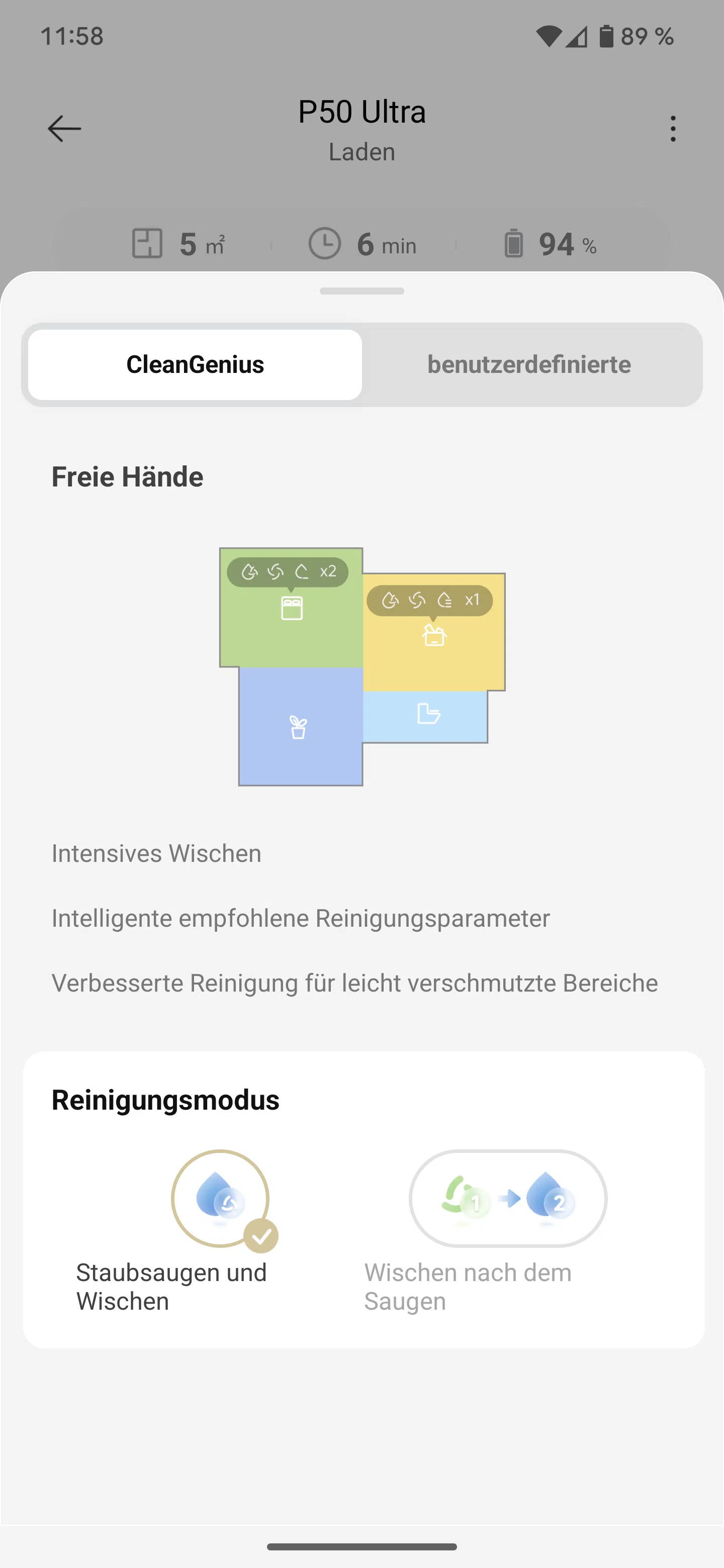Im ersten Menü, welches ihr beim Starten der App seht, könnt ihr die Gesamtreinigung starten, aber auch Shortcuts hinterlegen, wo ihr bestimmte Reinigungsvorgänge speichern könnt. Denn neben der automatischen Reinigung, die man hier CleanGenius nennt, gibt es auch einen benutzerdefinierten Modus. Ihr könnt den Saugroboter Saugen, Wischen, Staubsaugen und Wischen und Wischen nach dem Saugen lassen.