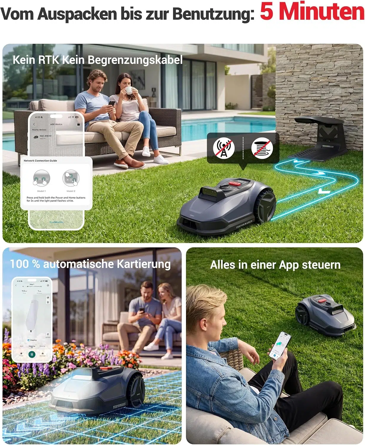 Nein. Der Roboter navigiert ausschließlich über sein Kamerasystem. Man muss weder einen Begrenzungsdraht verlegen noch eine RTK-Antenne im Garten aufstellen.