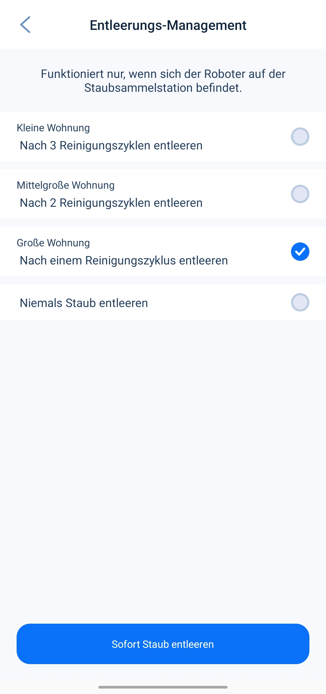Nach getaner Arbeit kehrt der Saugroboter zur Absaugstation zurück und wird über diese entleert. Der gesammelte Staub und Schmutz wandert dann in einen 2,8 l großen Staubbeutel. Dazu kann man in der App einstellen, nach wie vielen Reinigungszyklen die Staubkammer entleert werden muss. Das müsst ihr dann an eurer eigenen Situation festmachen oder aber ihr leert sie selber per Knopfdruck in der App aus. Sobald die Absaugung beginnt, folgt der Lärm. So eine Absaugung der Staubkammer wird sehr laut und man sollte auf schreckhafte Haustiere oder schlafende Personen in der Umgebung achten.