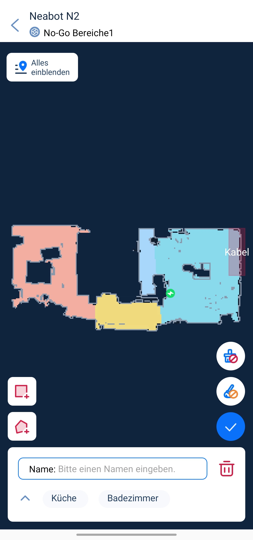 In der App könnt ihr die Karte des Saugroboters mit Sperrzonen und Nicht-Wischen-Zonen anpassen. Auch eine Umbenennung und Neuaufteilung der einzelnen erkannten Räume ist möglich. Möglich ist auch die flexible Anpassung der Reinigungsvorgänge. So könnt ihr zum Beispiel dem Neabot N2 sagen, dass er die Küche zweimal reinigen soll, während das Wohnzimmer nur einen Saugvorgang bekommt.