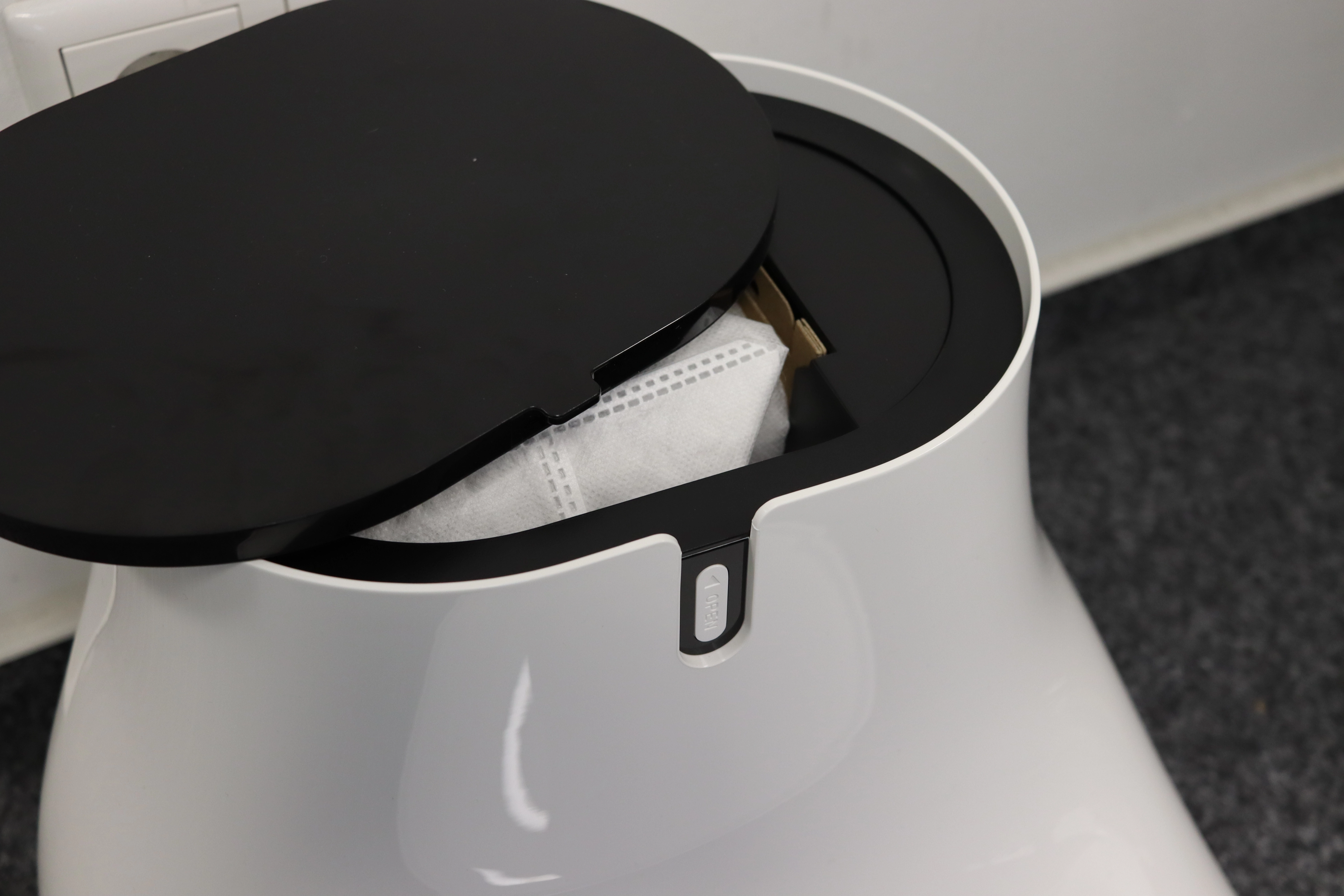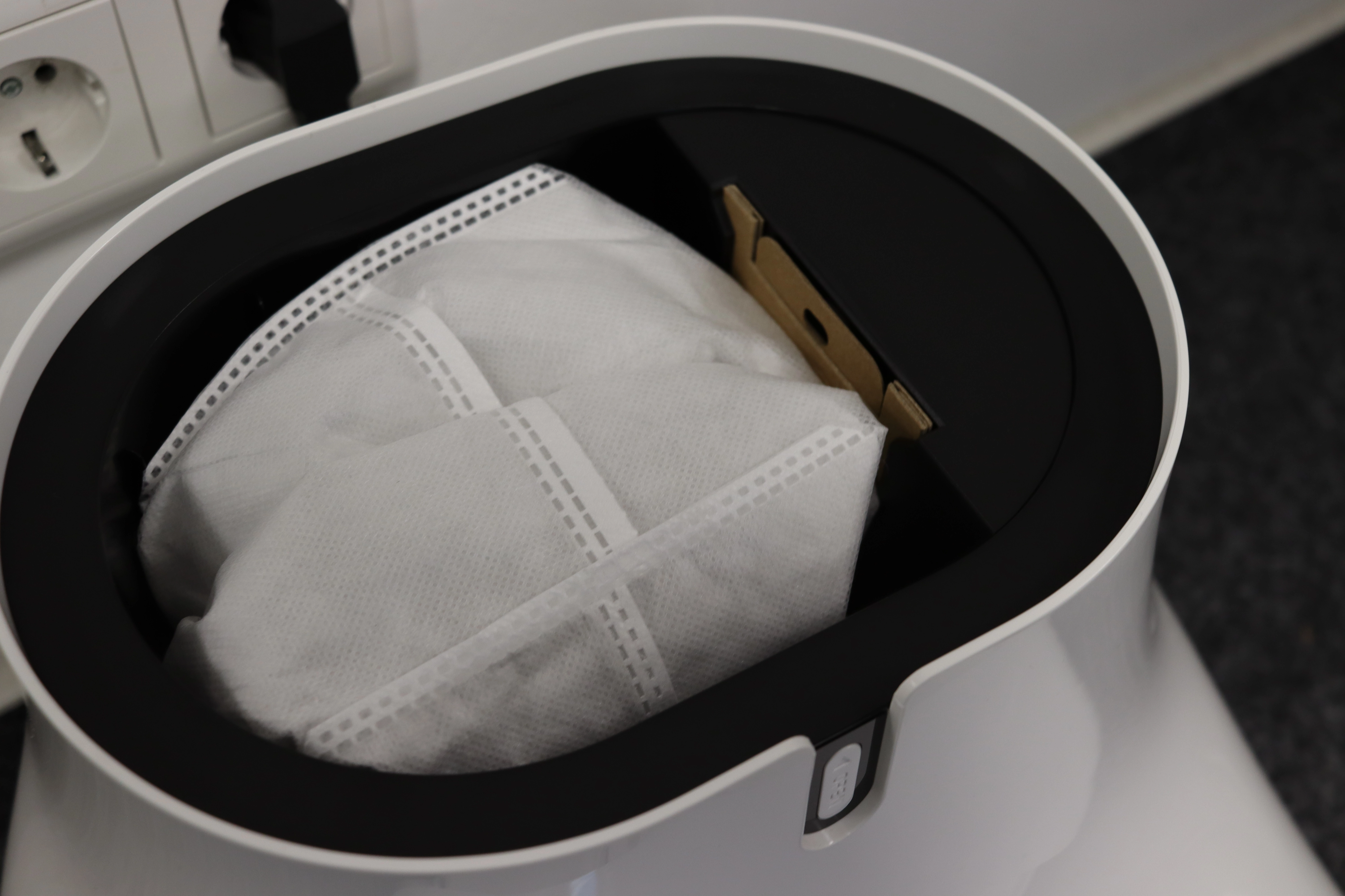 In Sachen Design ist der Saugroboter üblich gehalten. Er ist rund, überwiegend weiß und hat zwei Bedienelemente auf der Oberseite. Unter der Bedienfläche befindet sich ein blauer LED-Ring, dessen Helligkeit man in der App einstellen kann. Etwas mehr eigen ist Absaugstation, welche fast schon wie ein L-geformt ist. An der Oberseite befindet sich die Klappe zur Staubbeutelentnahme. Diese ist aber nicht mit einem Scharnier fest, sondern agiert eher als Deckel. Etwas ungewöhnlich, wenn man sonst immer die Kammer aufklappt.