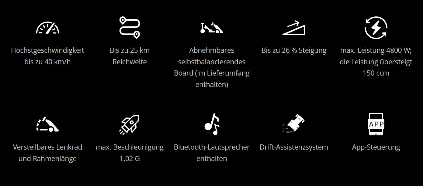 Das Gokart Pro bringt es auf eine Spitzengeschwindigkeit von 40 km/h, hat einen 432 Wh großen Akku für bis zu 25 Kilometer Reichweite und bewältigt Steigungen von bis zu 26%. Angetrieben wird es von einem Elektromotor mit maximal 4800 W Leistung. Die Bremsen sind elektronisch, es gibt aber zusätzlich eine mechanische Handbremse.