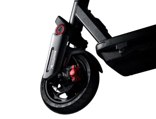 Die Reifen werden nochmal eine Nummer größer und haben nun einen Durchmesser von 11 Zoll. Es handelt sich zudem um sogenannte „selbstverschließende Reifen“, was in der Regel eine Gel-Füllung meint, die bei Schäden Risse automatisch verschließt. Beide Reifen haben Scheibenbremsen, die den Roller bei einer Vollbremsung bei 20 km/h in unter 3 Meter zum Stehen bringen – sehr gut.