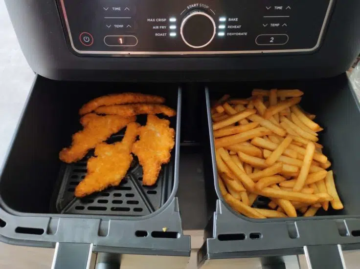 Die Sync-Funktion ist dafür gedacht, unterschiedliche Lebensmittel mit vielleicht verschiedenen Garprogrammen zur gleichen Zeit fertig werden zu lassen. Zum Beispiel links die Pommes im Max Crisp Mode für 10 Minuten, rechts die Chicken Nuggets im Air Fry Mode für 16 Minuten, beides kommt gleichzeitig heiß auf den Tisch.