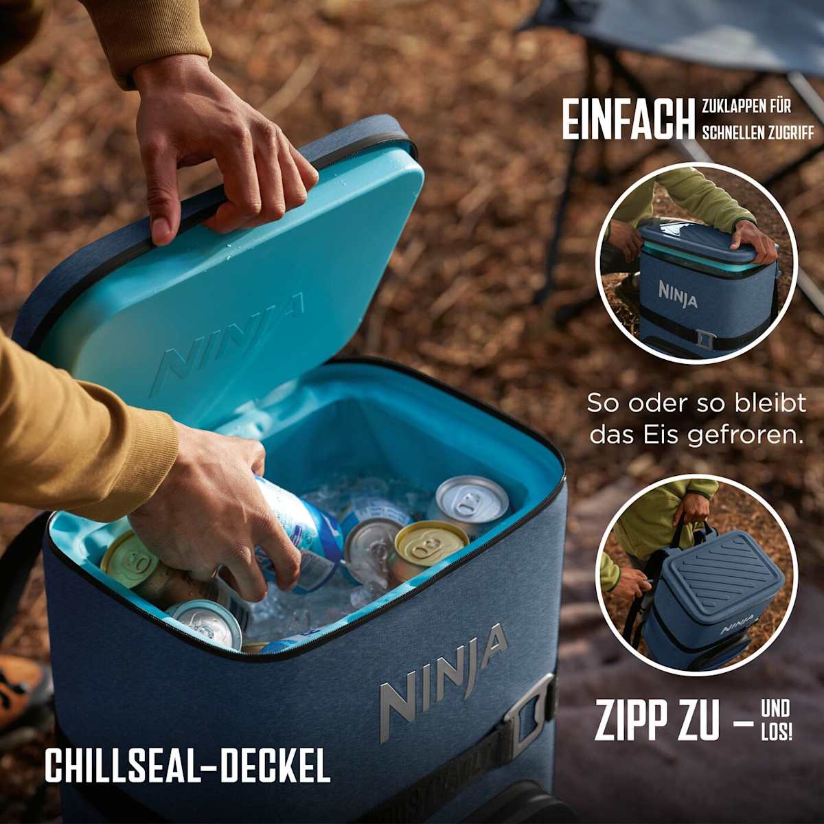Ein oft unterschätzter Faktor bei Kühlrucksäcken ist der Wärmeaustausch beim Öffnen. Ninja verbaut hier den sogenannten ChillSeal-Deckel. Dieser ist so konstruiert, dass er die Kälte auch dann im Inneren hält, wenn man den Reißverschluss gerade offen hat, um schnell nach einem Getränk zu greifen. Komplett verschlossen verspricht Ninja zudem einen hundertprozentigen auslaufsicheren Schutz.