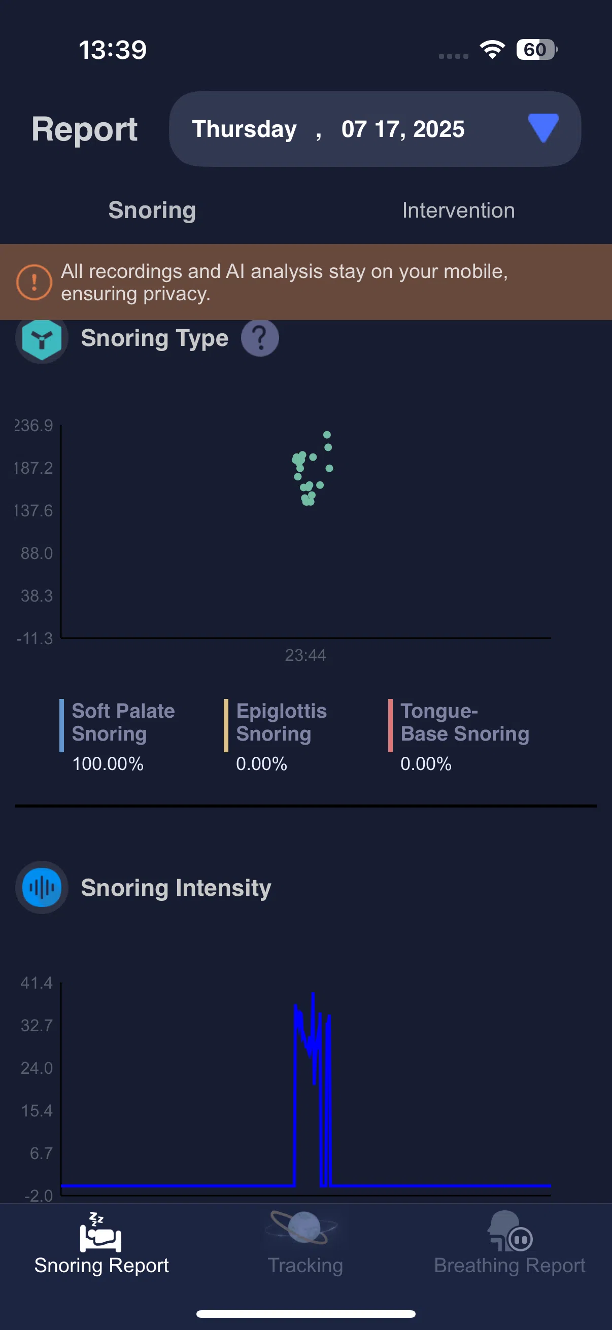 Die angeblich aufgezeichneten Audio-Dateien des Schnarchens lassen sich nicht abspielen, was trotz Anzeige von abspielbaren Dateien schon irgendwie sehr verwirrend ist. Ebenso unklar ist, was man aus den präsentierten Daten und Graphen wirklich ablesen soll – wir hätten uns mehr Erklärungen gewünscht. Das Einzige, was überraschend schnell und problemlos funktioniert, ist das initiale Pairing via Bluetooth.Ein weiterer nerviger Punkt ist, dass das Handy die ganze Zeit neben dem Kissen liegen muss und der Akku zu Beginn entweder über 50 % haben oder am Ladegerät hängen muss.