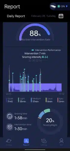 Interessanter ist da schon der „Report“-Tab, in dem eine in Prozent angegebene Effektivitätsrate in Bezug auf die Intervention durch das Kissen (also das Luftkammern-bedingte Neigen des Kopfes), ein Diagramm zur Schnarchlautstärke und -zeit sowie zur insgesamt aufgebrachten Interventionszeit pro Nacht zu finden ist.