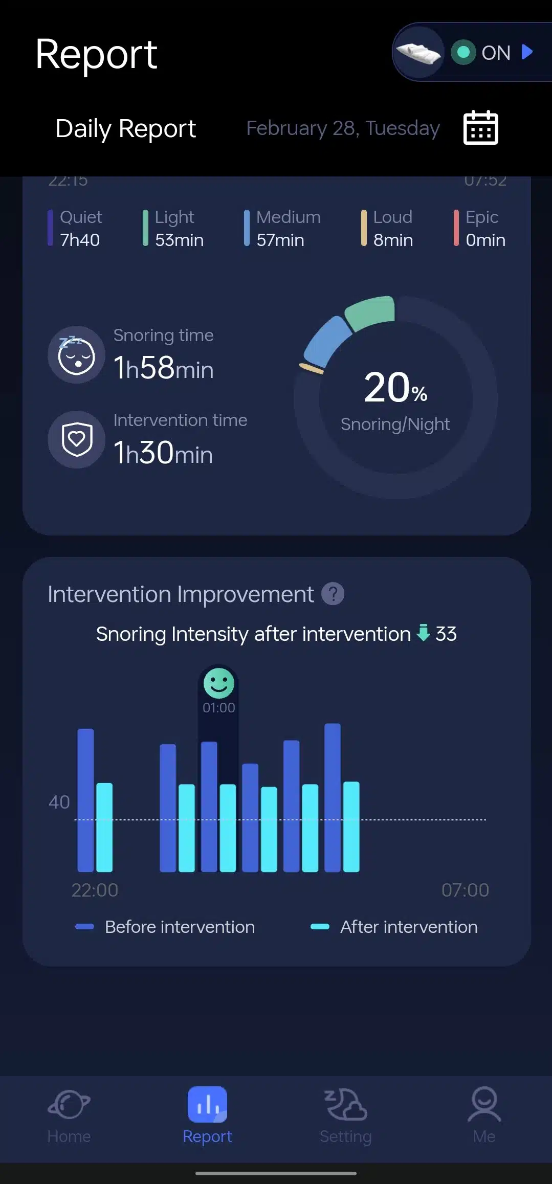 Über ein altes Redmi Note 7 Pro ist die Kopplung dann aber problemlos möglich. Ich finde die App gelungen. Sie gliedert sich in die Tabs „Home“, „Report“, „Setting“ und „Me“. Der „Home“-Screen könnte aber effektiver genutzt werden. Hier geht viel Platz für ein Werbevideo zum Kissen und allgemeinen Infos zum Schnarchen verloren.