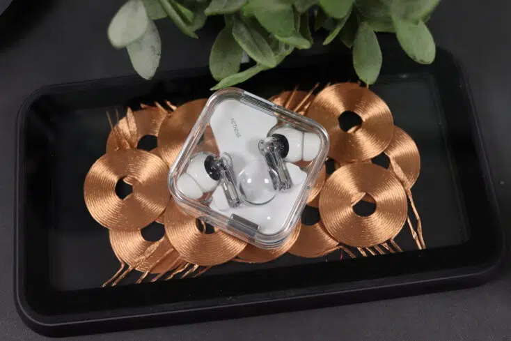 So sind die Nothing ear meiner Meinung nach immer noch schick anzusehen und sind wie gehabt in komplett Schwarz und mit weißen Akzenten zu haben. Die Hörerstäbe sind weiterhin auf der Rückseite transparent und auch die Ladeschale ist zum großen Teil durchsichtig.