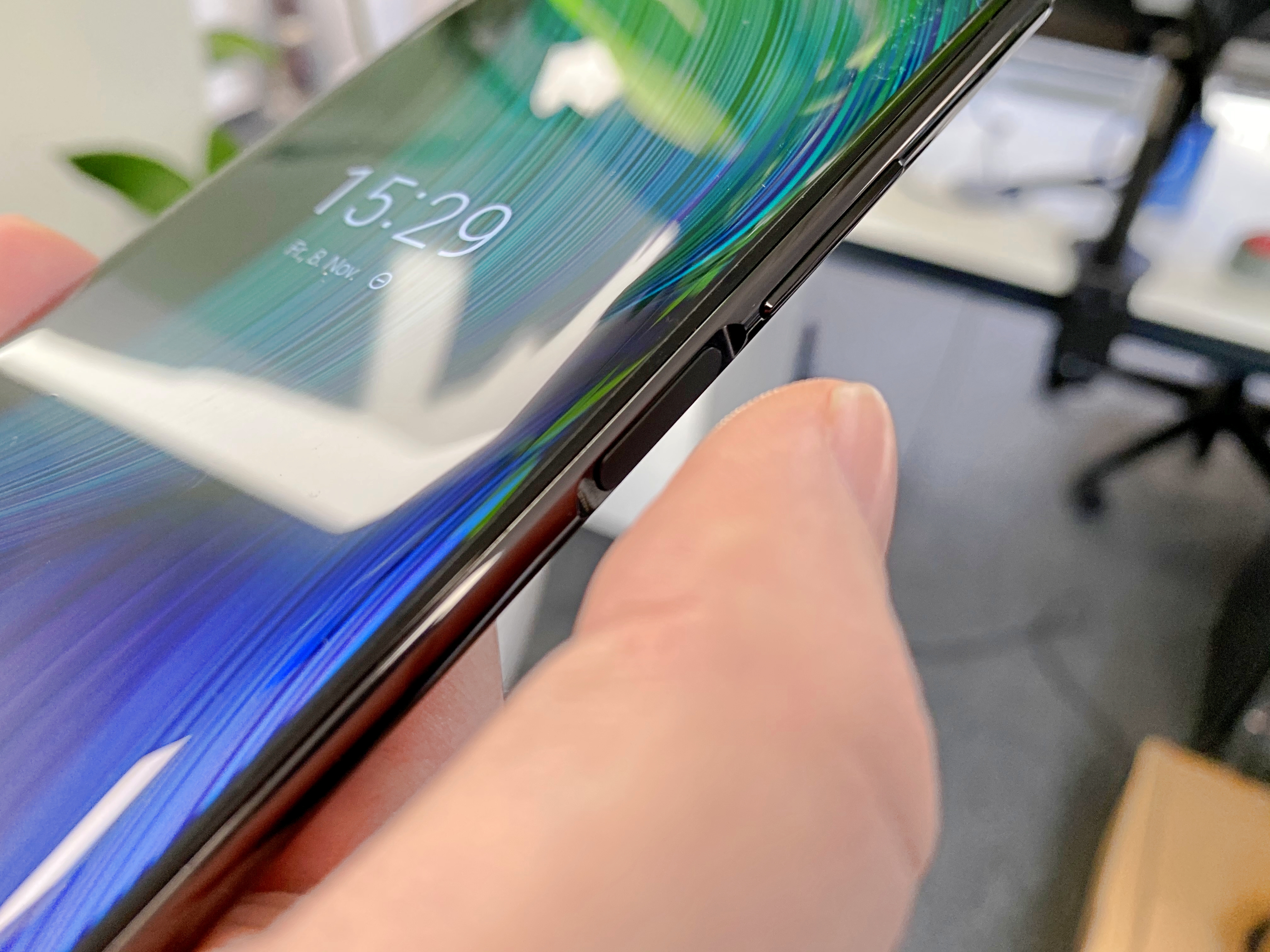 An der linken Seite ist dann der Dual-Nano-SIM-Slot (ohne Speichererweiterung) und einer der zwei Fingerabdrucksensoren. Diese liegen direkt gegenüber auf einer guten Höhe und sorgen dafür, dass man das Z20 immer per Fingerabdruck entsperren kann, egal welchen Bildschirm ihr gerade nutzen wollt. Da hier die alten kapazitiven Fingerabdrucksensoren zum Einsatz kommen, funktioniert das Entsperren immer und schneller als jeder In-Display-Fingerabdrucksensor. Außerdem sind die beiden Sensoren in echten Tasten verbaut, man hat hier also Power-Button und Sensor in einem.