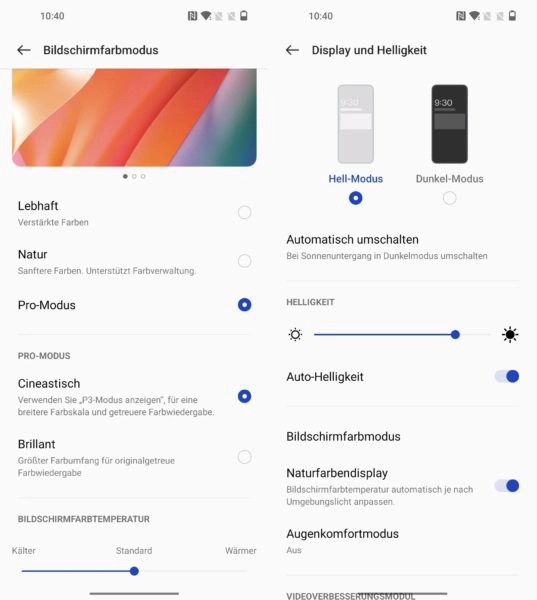 Apropos Farben – es handelt sich wieder um ein 10bit-Display, welches 1,07 Milliarden Farben darstellen kann. In den Einstellungen hat man die Wahl zwischen verschiedenen Farbmodi für das Display. Standardmäßig ist „Lebhaft“ eingestellt, es gibt aber noch „Natur“ und im Pro-Modus die Optionen „Cineastisch“ (DCI-P3) und „Brilliant“. Bei allen Modi kann man zusätzlich noch die Farbtemperatur anpassen.