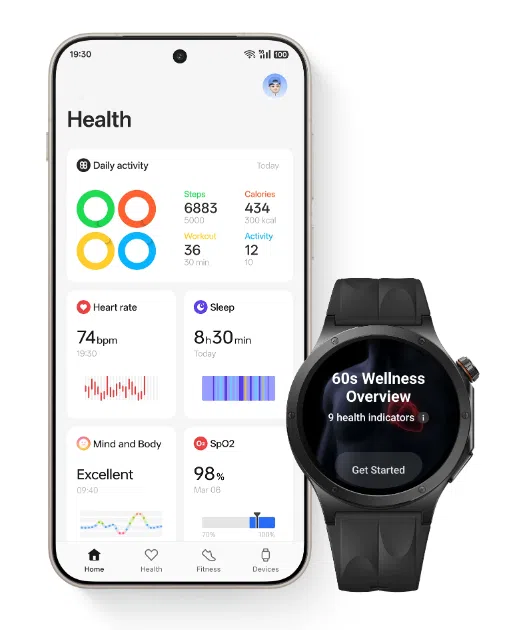 Im Bereich Gesundheit und Fitness bietet man über 100 Sportmodi inklusive automatischer Erkennung für sechs Sportarten. Neben den gängigen Messungen von Puls, Sauerstoffsättigung (SpO2) und Hauttemperatur greift das System auf einen Beschleunigungssensor, ein Gyroskop sowie geomagnetische, Licht- und Luftdrucksensoren zurück. Neu dabei sind jedoch eine Sturzerkennung (Watch 3: nicht vorhanden) für Notfälle und ein integrierter Pace-Assistent, der Läufer in Echtzeit anleitet. Auch der 60-Sekunden-Gesundheitscheck ist wieder dabei, welcher je nach regionaler Zertifizierung nun auch EKG-Funktionen unterstützen soll.