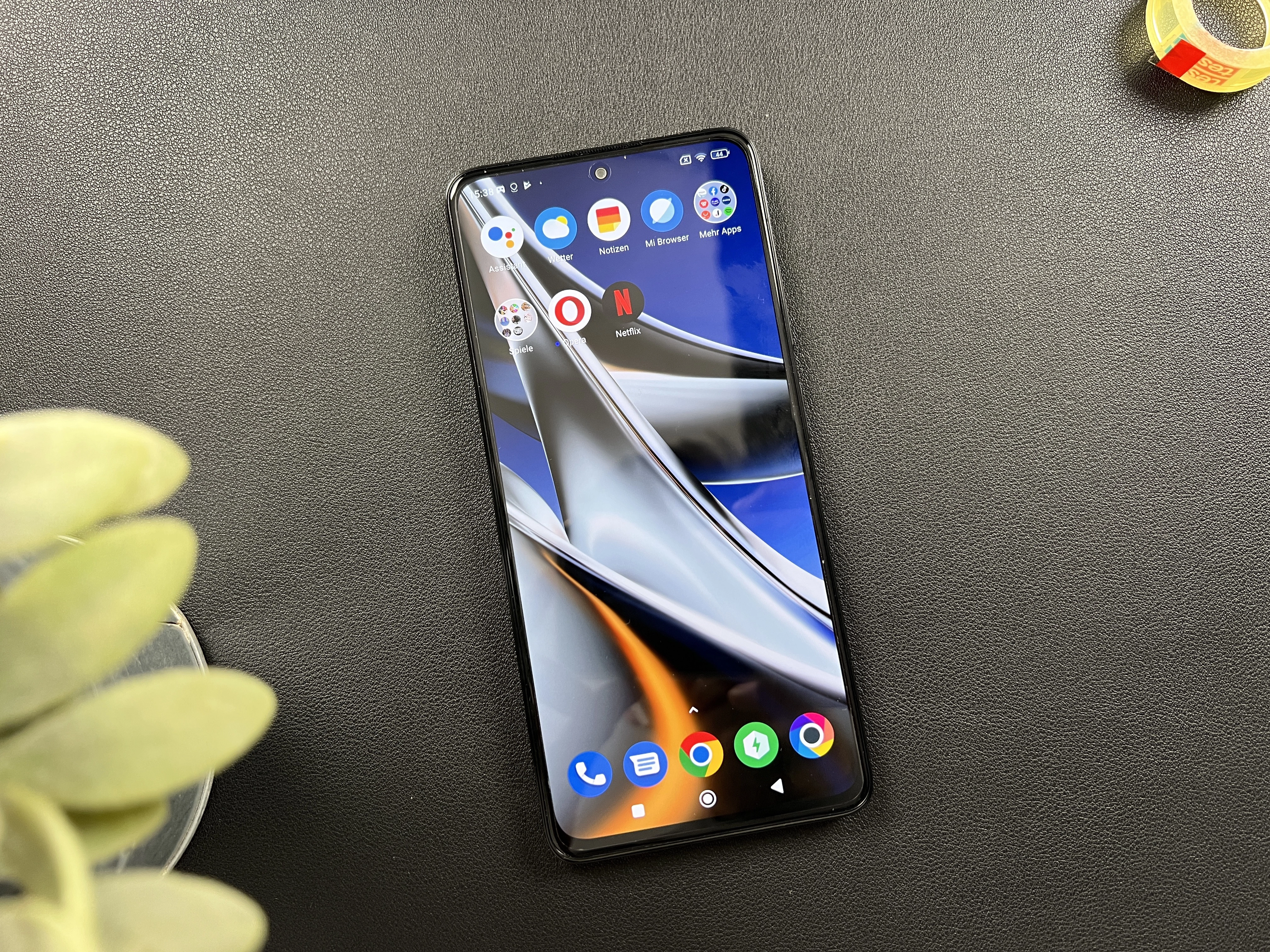 In der Hand fühlt es sich somit insgesamt gut an, mit einer Displaydiagonale von 6,67″ gehört es zu „normal“ großen Smartphones. Der Kamera-Bump ist weit genug oben, damit er nicht stört. Der Fingerabdrucksensor arbeitet auch als Power-Button und ist als Rechtshänder gut zu erreichen. Aufgrund der Kunststoff-Verarbeitung fällt das Gewicht mit 205 g trotz der Größe nicht ganz so groß aus wie bei einem OPPO Find X5 Pro mit Keramik-Rückseite. Zumindest auf der Vorderseite entscheidet sich POCO hier aber für Gorilla Glas, sogar für die fünfte Generation.