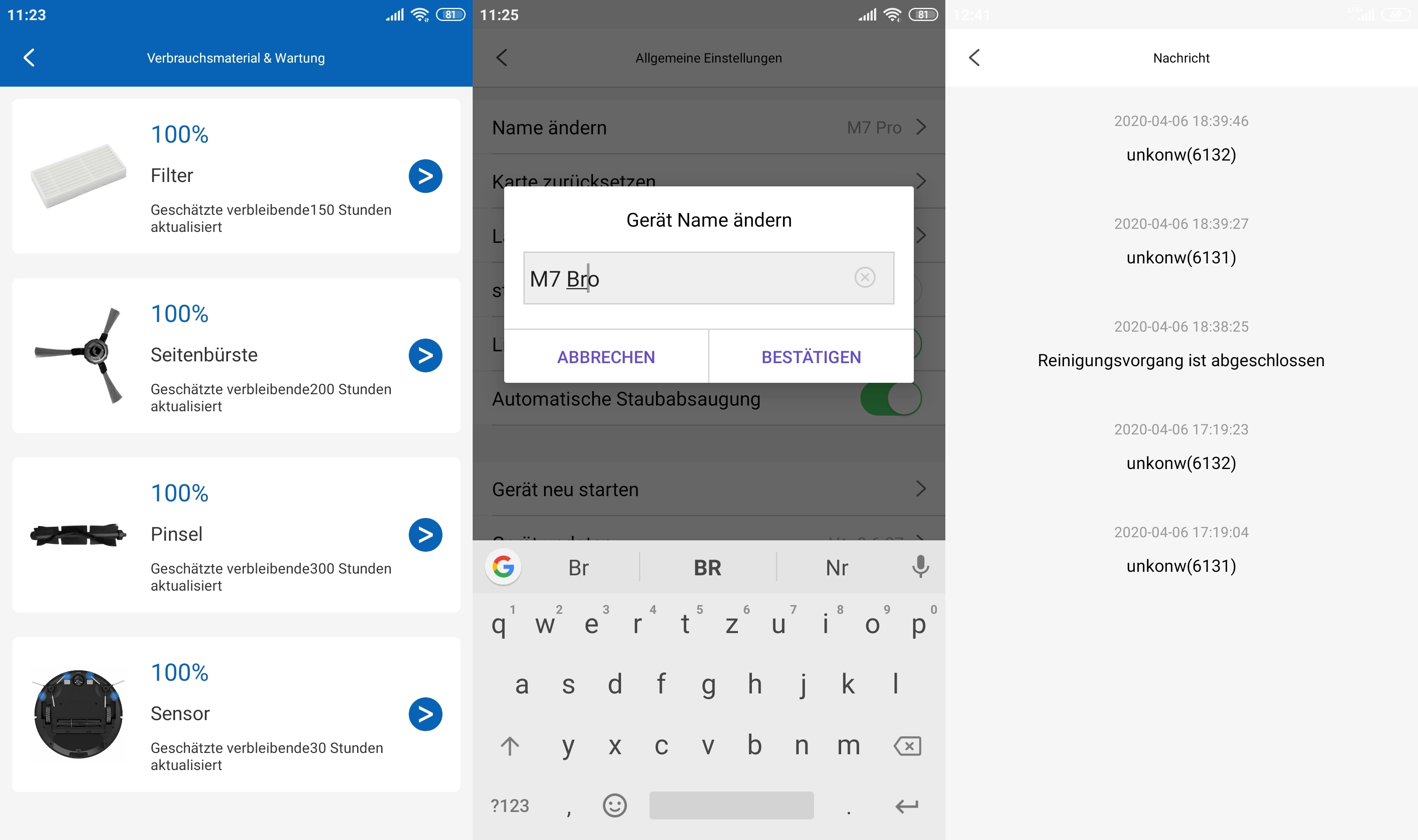 Die ProscenicHome App (für Android und iOS) ist in mittelprächtigem, aber verständlichem Deutsch gehalten. Über die App lässt sich der Saugroboter von überall aus steuern, vorausgesetzt er ist eingeschaltet und man hat eine Internetverbindung unterwegs und am Standpunkt des Roboters.