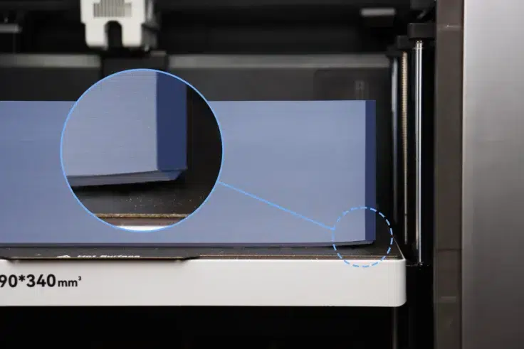Ein weiteres klassisches Problem bei großen Druckern ist die ungleichmäßige Hitzeverteilung des Druckbetts. Qidi will auch hier eine Lösung gefunden haben. Das 390 x 390 mm große Heizbett verfügt über eine vollflächige Silikonheizmatte mit extrem dicht verlegten Heizdrähten. Zusammen mit einer Isolierschicht soll das für eine außergewöhnlich homogene Temperaturverteilung sorgen – Schluss mit Warping, weil die Ecken des Drucks kalt werden. Große Versprechen an dieser Stelle.