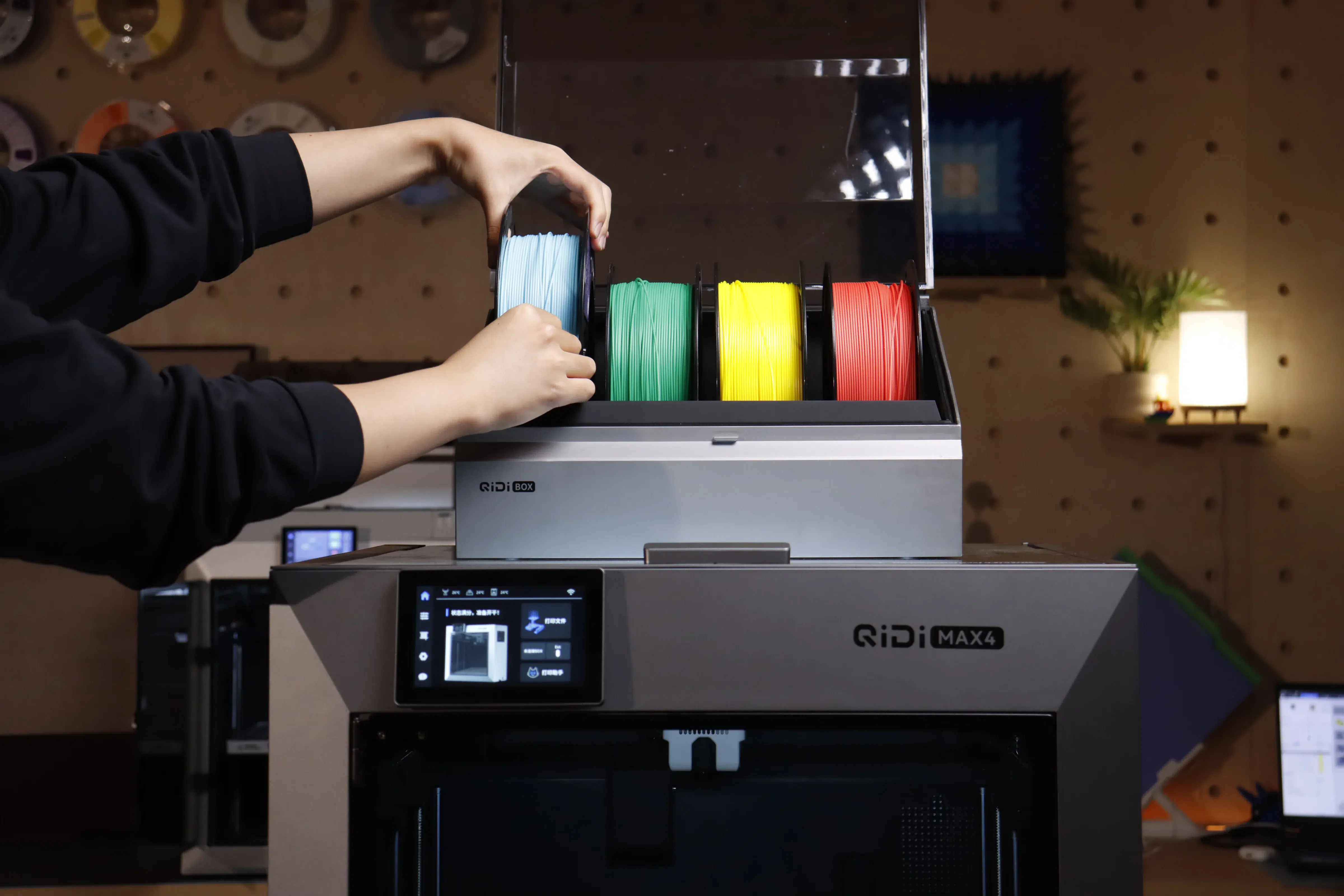 Natürlich sind auch smarte Features an Bord: Eine KI-Kamera überwacht den Druck und erkennt aktiv häufige Probleme wie „Spaghetti-Druck“, um Fehldrucke zu verhindern. Für alle, die mehr wollen als nur eine Farbe, ist der Max4 zudem mit der QIDI Box kompatibel, einem externen Multicolorsystem, das bis zu 16 Farben oder Materialien ermöglicht und ebenfalls über eine integrierte 65°C-Trocknungsfunktion verfügt. Die Qidi Box ist zudem für den Gebrauch von Carbon-Filamenten und TPU ausgelegt.