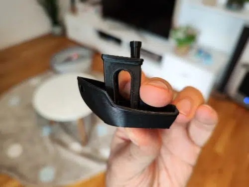 Zuerst einmal verwenden wir das von Qidi mitgelieferte „Rapido“ PLA in Schwarz und drucken damit das Vorzeige-Benchy, das mittlerweile jeder Hersteller in seinem Gerätespeicher hat: Ein Vorzeige-Benchy ist es nach gerade einmal 17 Minuten aber nur bedingt – gerade wenn man bedenkt, dass Schwarz genauso wie Weiß wunderbar Druckfehler kaschiert. Oberhalb der üblichen Rumpflinie („Hull-Line“) sind die Layer nicht mehr so schön plan übereinander wie zuvor. Hinzu kommen Druckfehler am Bug und hinten am Heck. Der Rest sieht bis auf ein wenig Stringing ordentlich aus – insbesondere für schlappe 17 Minuten.