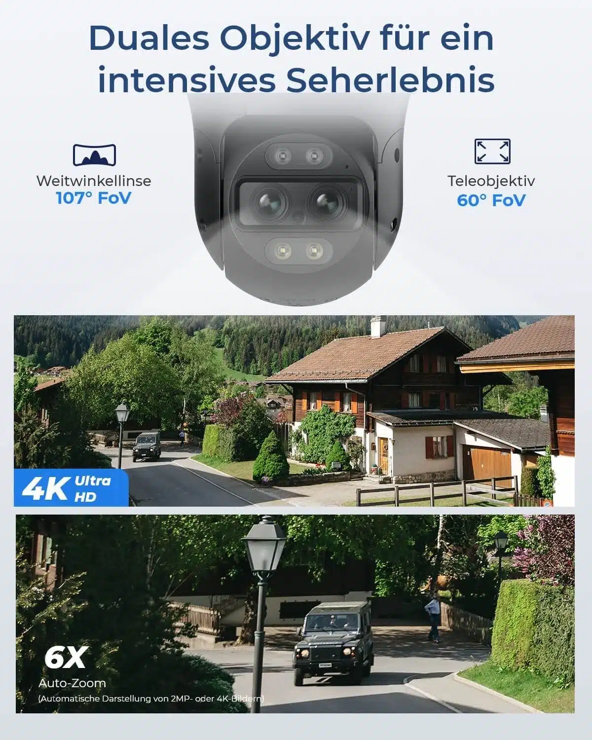 Worin sich die Reolink TrackMix PoE 4k PTZ und ihre Modellvarianten aber von den anderen Reolink-Kameras am meisten unterscheiden, ist ihr neues Feature mit dem Namen TrackMix. Reolink verbaut hier ein Weitwinkel- und ein Teleobjektiv, was in der Reolink-App eine Dualansicht in der Art eines vertikalen Splitscreens ermöglicht: Beide Objektive erfassen ein sich bewegendes Objekt („Dualtracking„), dem die Kamera durch Schwenken und Neigen folgt. Oben in der Reolink-App-Ansicht passiert dies mittels Weitwinkelaufnahme. Unten hingegen durch ein Zusammenspiel von Weitwinkel- und Teleobjektiv um an das Objekt möglichst nah heranzuzoomen und es genau verfolgen zu können.