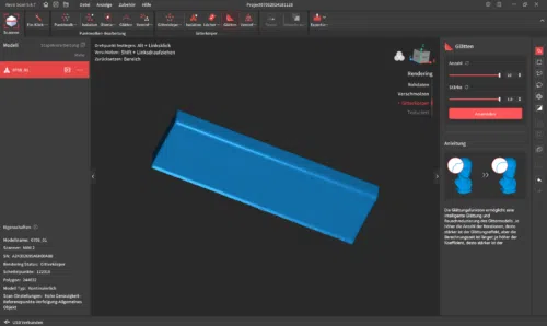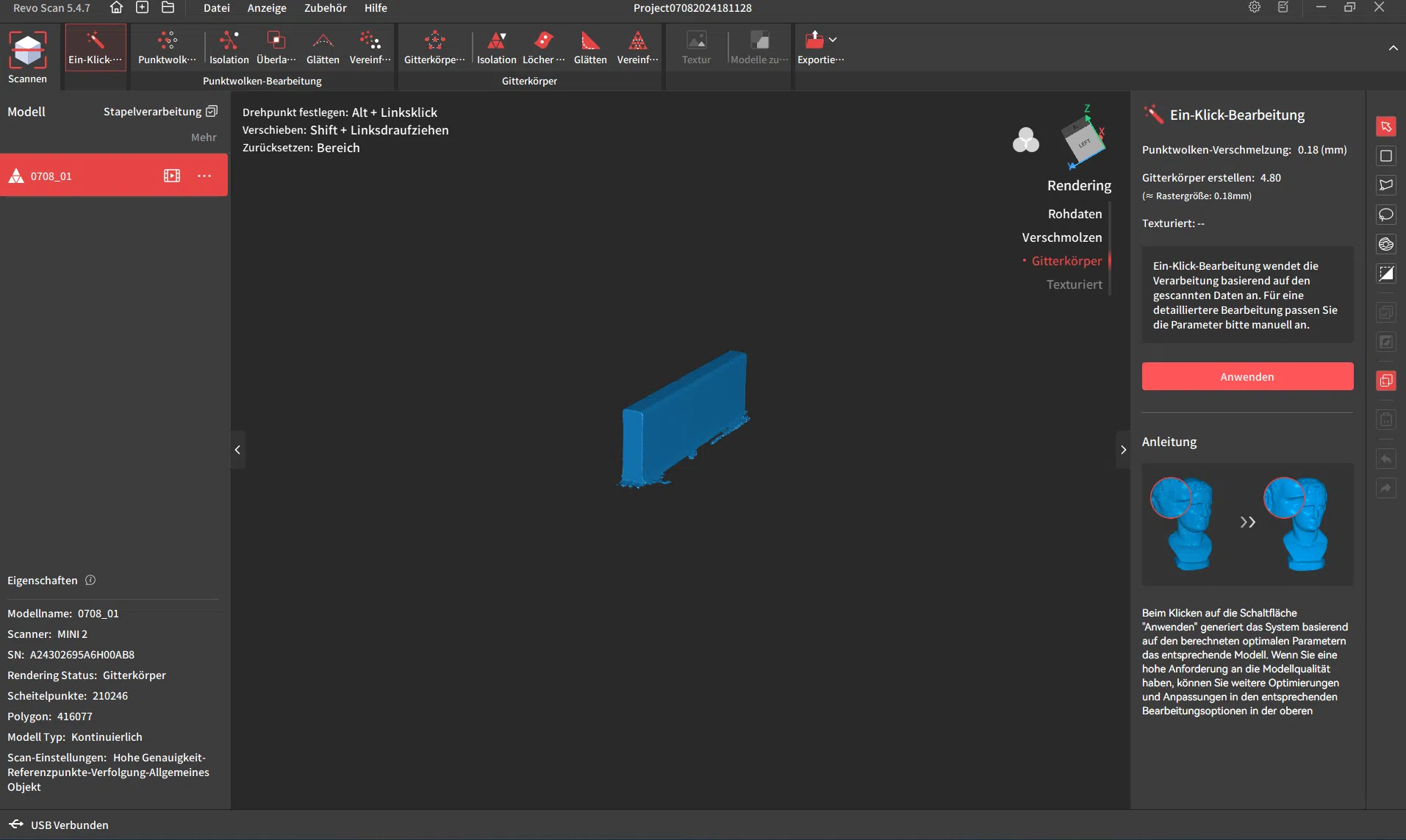 Nach dem Scannen kann ich diese genannten Reiter manuell abarbeiten oder aber die „Ein-Klick-Bearbeitung“ wählen und mir damit die Punktwolkenbearbeitung sparen. Das klappt im Test ausgezeichnet – die Löcher muss ich aber nach wie vor manuell stopfen.