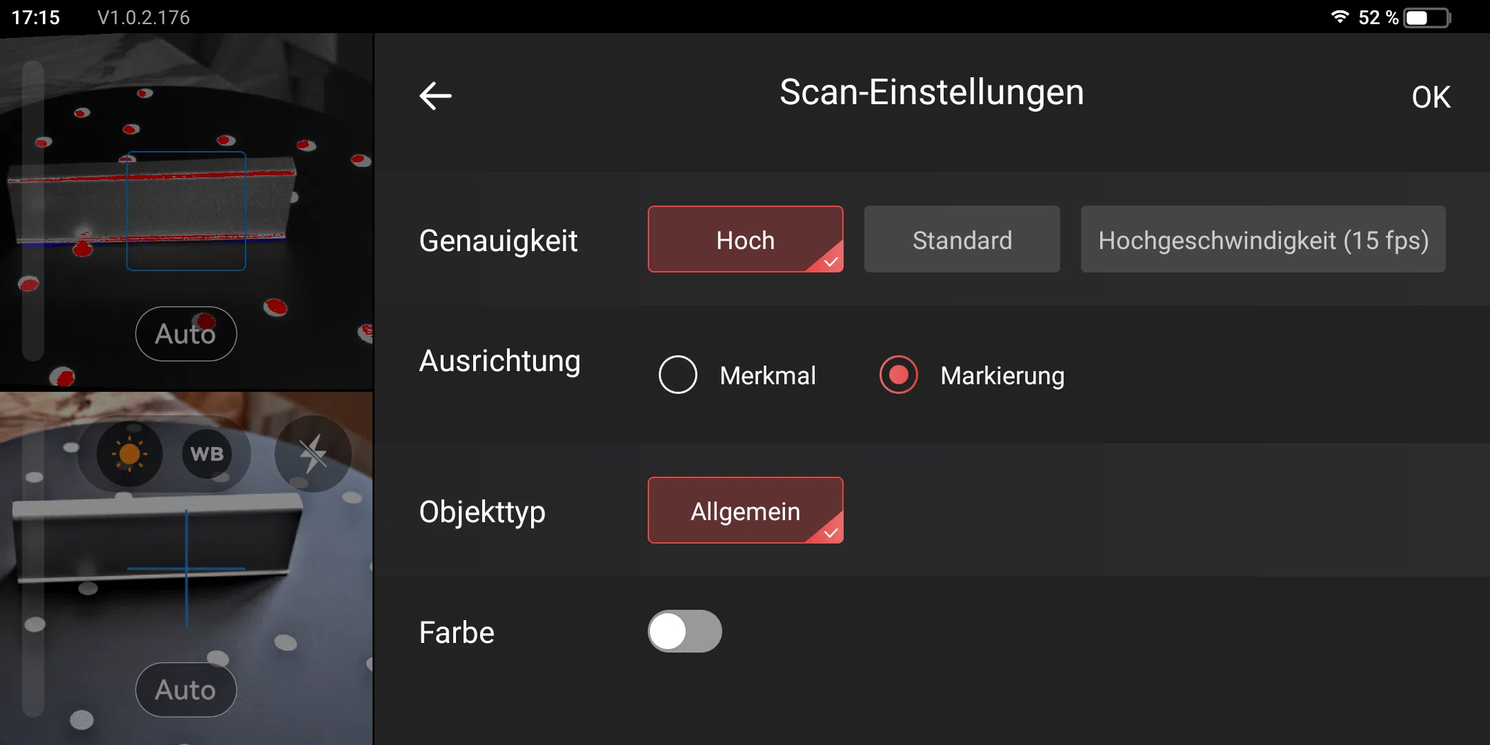 Die Scaneinstellungen entscheiden maßgeblich darüber, ob und wie gut ein Objekt gescannt wird. Wichtig ist dabei das Icon über der Aufnahmetaste, welches mich zu den Scaneinstellungen führt. Hier entscheide ich einmal, wie hoch die Scangenauigkeit sein soll, ob ich ein allgemeines oder dunkles Objekt scannen will und ob das Ganze mit Farbe erfolgen soll. Insbesondere der Punkt „Ausrichtung“ ist hier zentral: Denn einfache Geometrien lassen sich oft viel besser mit der Option „Markierung“ und entsprechender Marker-Unterlage auf dem Drehteller scannen als mit der Standardeinstellung „Merkmal“.