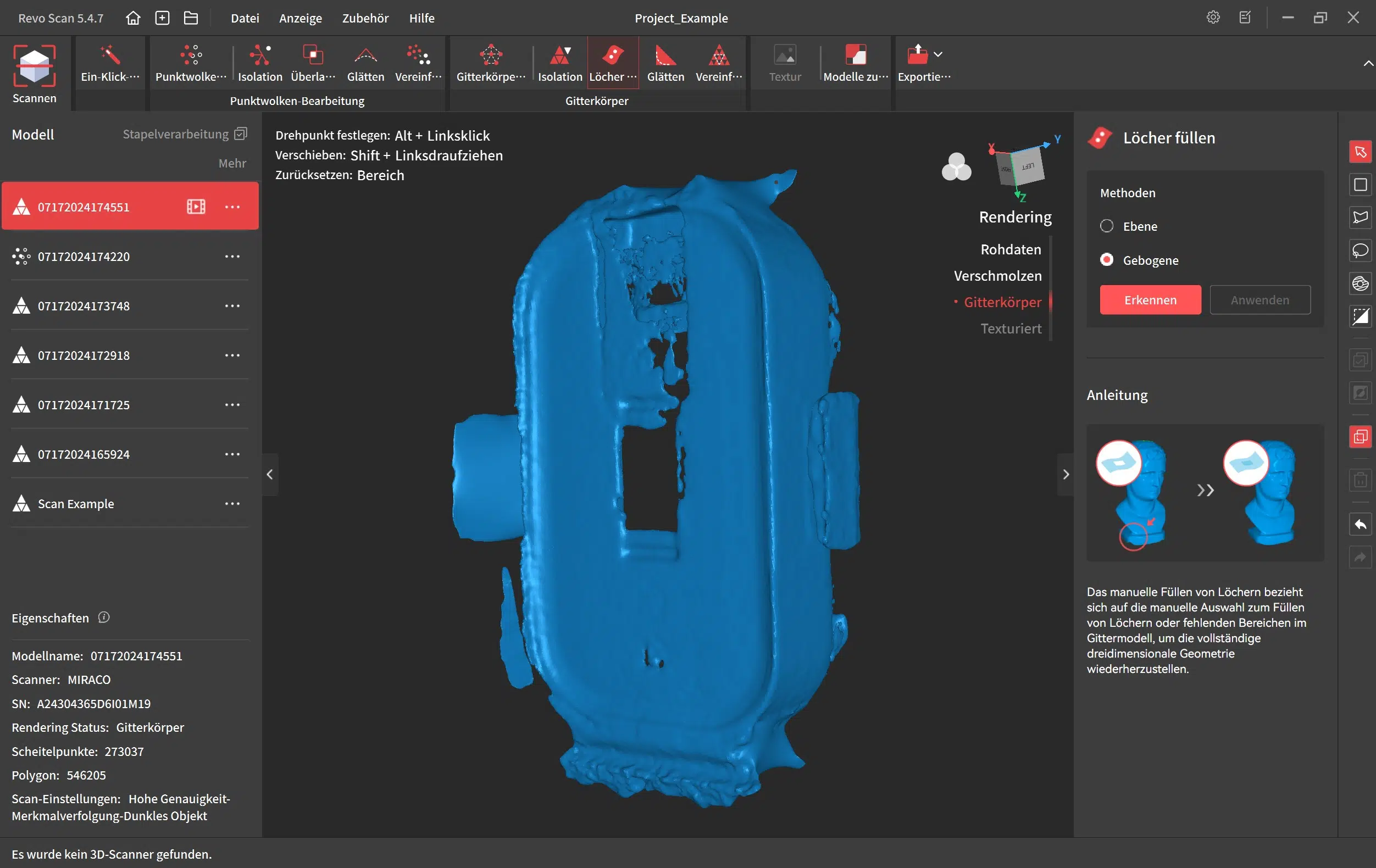 Die Übertragung an Revo Scan 5 hingegen ist super komfortabel. Ich öffne ein neues Projekt in der PC-Software, gehe auf „Datei“ und kann dort „Von Miraco importieren“ auswählen. Im Scanner gehe ich auf das zu exportierende Scan-Projekt und wähle „Teilen“. Nach Eingabe eines angezeigten Codes, den Revo Scan 5 bereitstellt, wird das Projekt auf den Rechner transferiert. Ein Projekt? Nein! Alle bisherigen! Hier wünsche ich mir ein weiteres Menü nach Eingabe des Verbindungs-Codes, in dem ich explizit auswählen kann, welches einzelne Projekt ich in Revo Scan 5 importieren möchte. Einfacher geht es über die Nutzung des USB-C-Kabels. Hier habe ich direkt Zugriff auf alle Dateien, die auf dem Revopoint Miraco liegen. Mehr zu Revo Scan 5 erfahrt ihr im Test zum Revopoint Mini 2.