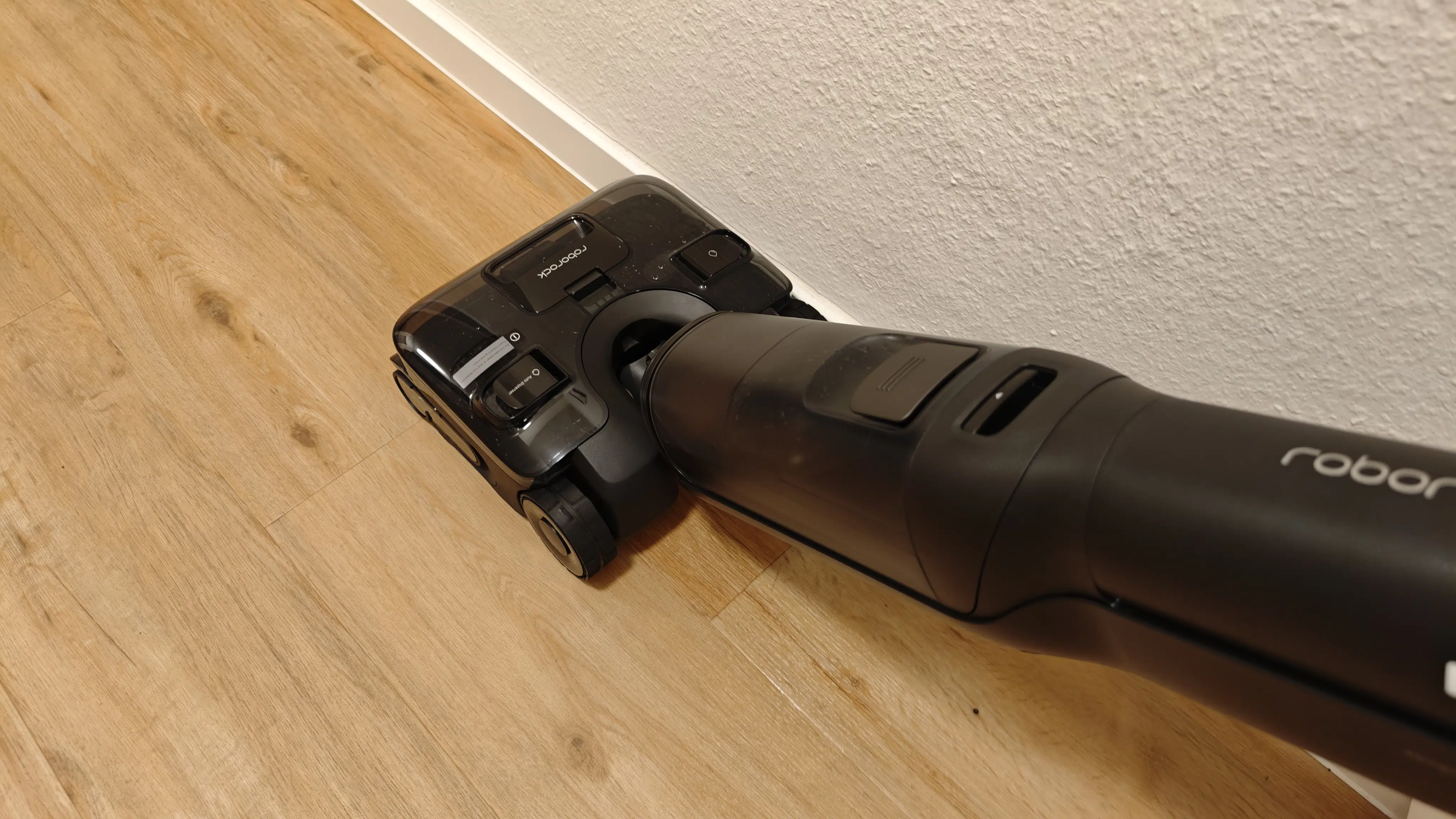 Unterstützt wird das von starken 25.000 Pa Saugkraft. Damit sich keine Haare um die Walze wickeln, gibt es das JawScrapers-Design mit Klingen an der Bürste. Was beim Design sofort positiv auffällt, ist die Platzierung des 1.000-ml-Frischwassertanks. Der sitzt nämlich direkt auf dem Wischkopf. Das hat zwei Vorteile: Erstens drückt das Gewicht ordentlich auf den Boden und zweitens muss man das Gewicht vom Wasser nicht im Handteil mit sich herumschleppen. Das Schmutzwasser landet separat in einem 720 ml Tank.