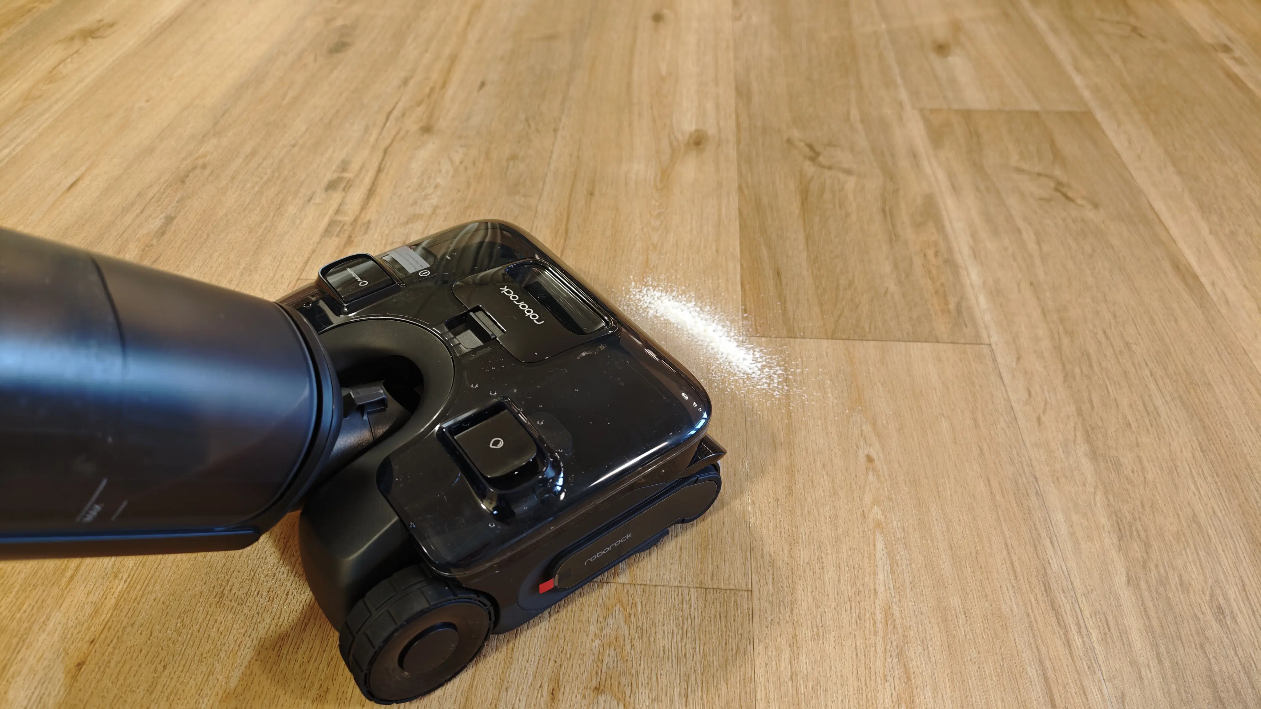 Das Highlight ist hier ganz klar die JetFoaming-Technologie. Per Knopfdruck sprüht der Sauger Schaum auf den Boden, was laut Roborock Flecken deutlich besser lösen soll als reines Wasser. Damit man direkt loslegen kann, liegt eine 480-ml-Flasche Schaumreinigungslösung direkt bei.