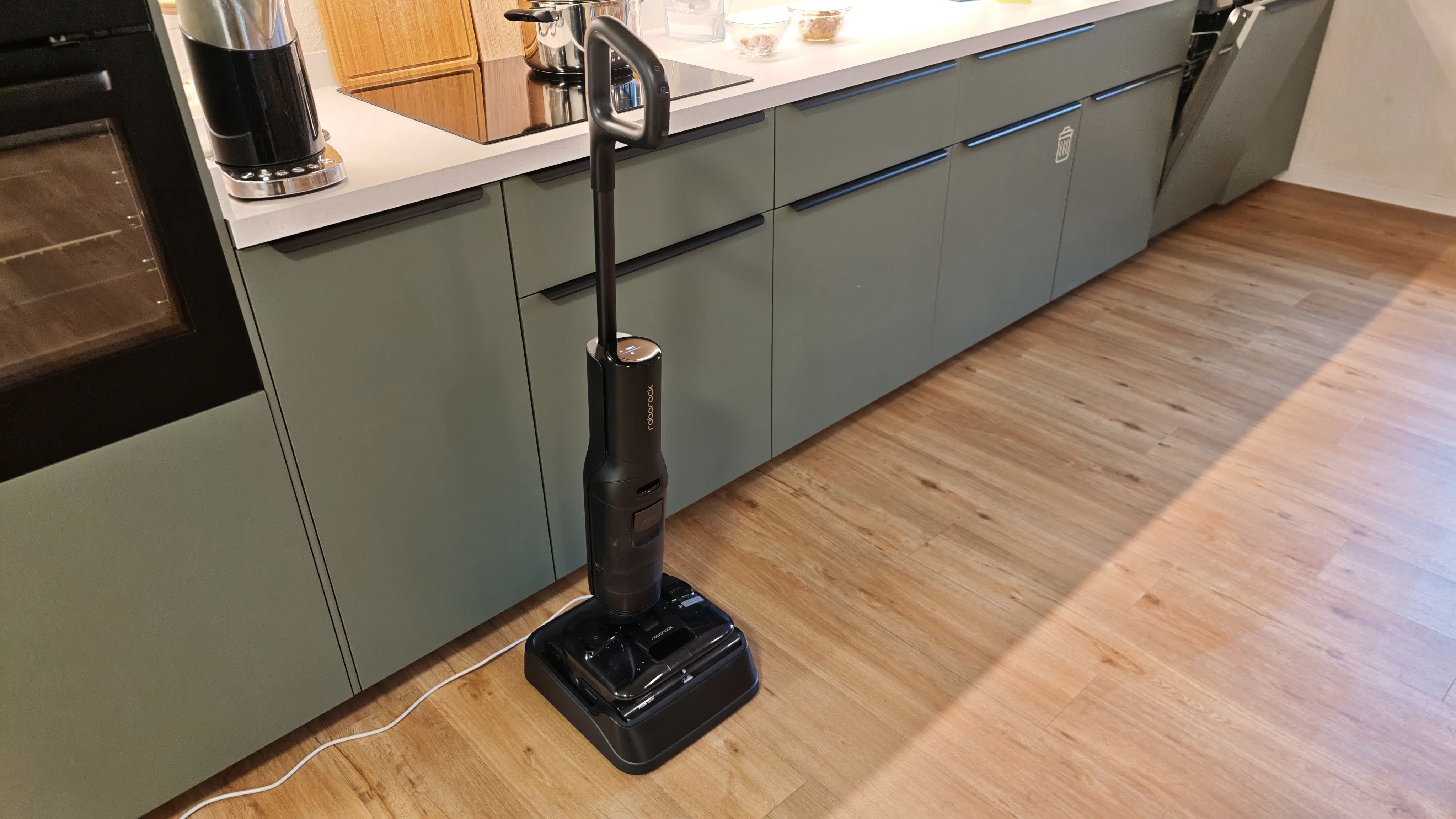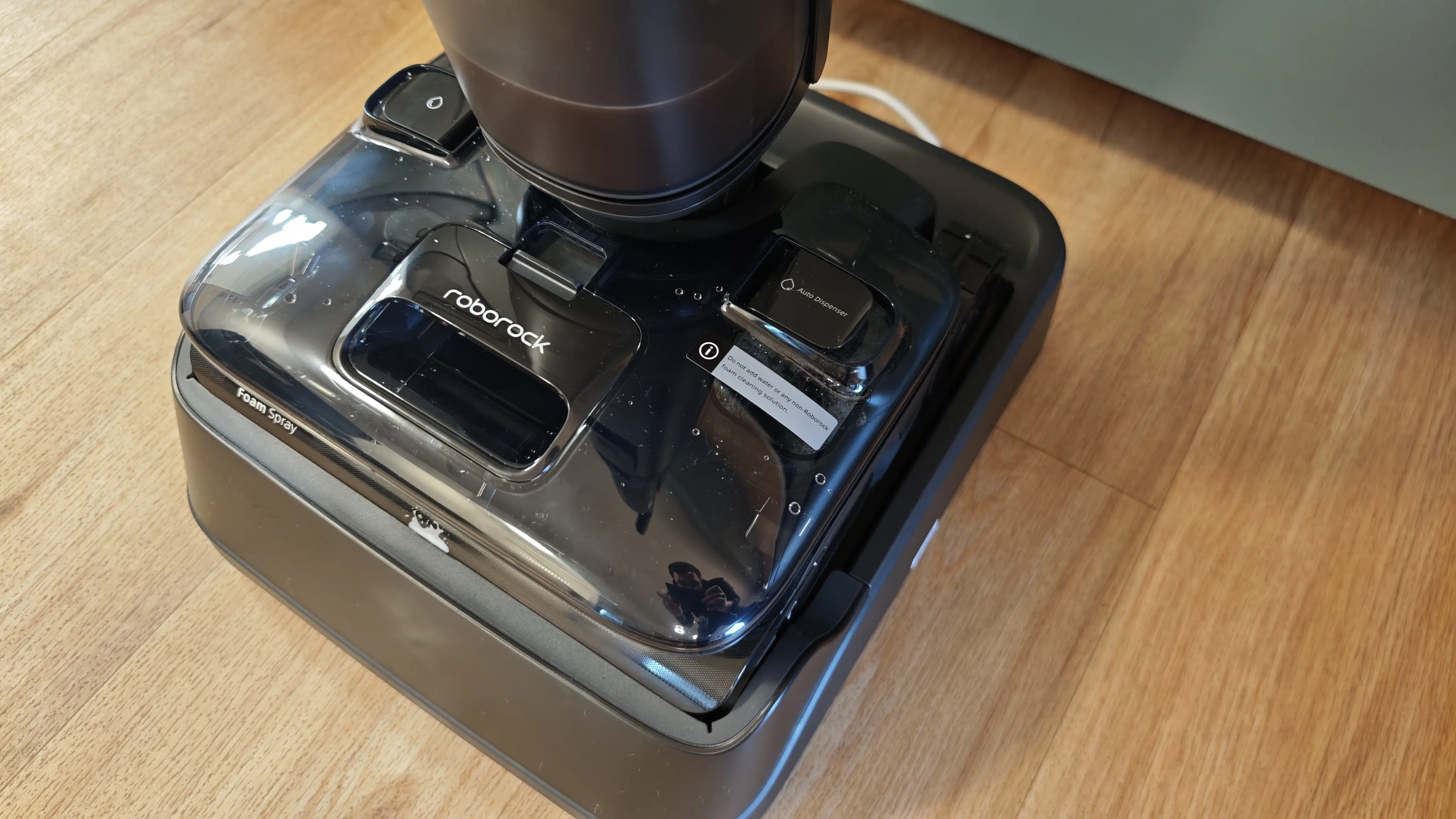 Die Reinigungsstation wäscht die Walze mit 95 °C heißem Wasser, um Bakterien und Gerüche effektiv zu beseitigen. Anschließend erfolgt eine schnelle Heißlufttrocknung innerhalb von 5 Minuten. Es gibt zudem einen leiseren Modus, der etwas länger trocknet.