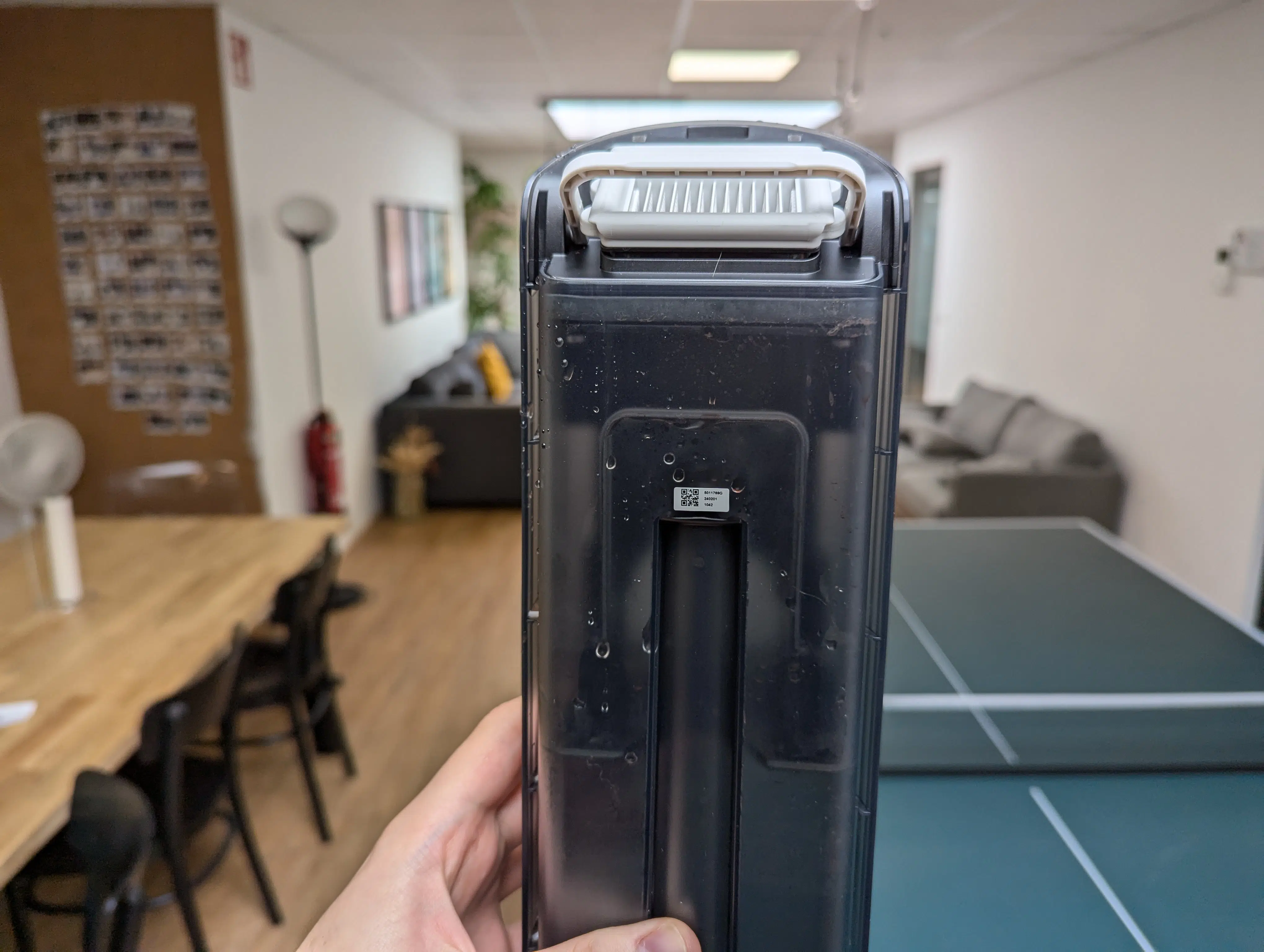 Nach der Reinigung setzt man den Wischakkusauger in die Station und aktiviert dort die Selbstreinigung. Bei dieser spült sich das Gerät einmal durch und ist anschließend für das nächste Mal wieder bereit. Damit keine Bakterien und üble Gerüche entstehen können, trocknet die Ladestation die Walze anschließend mit 50 °C warmer Luft. Innerhalb von einer Stunde ist die Walze dann trocken.