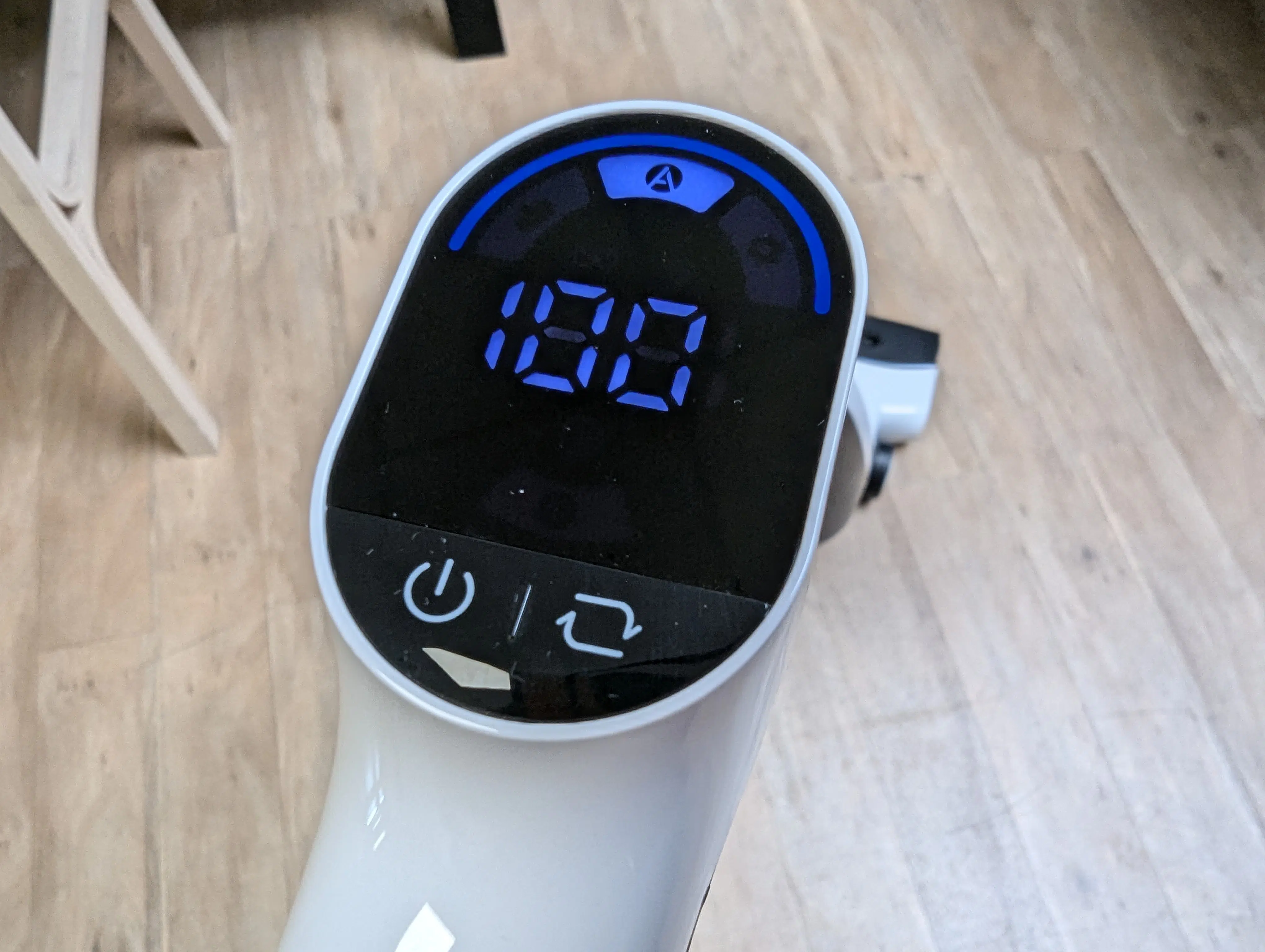Die Bedienung des Roborock Flexi Lite befindet sich an der Oberseite und erfolgt über zwei Knöpfe unter dem Bildschirm. Ein Knopf ist für das Ein- und Ausschalten zuständig, während der andere den aktuellen Reinigungsmodus wechselt. Eine Lautsprecheransage gibt jeweils Feedback, zusätzlich wird auf dem Bildschirm der Akkustand und Reinigungsmodus angezeigt. Ein weiterer Knopf befindet sich noch weiter unten am Griff. Dieser ist dafür zuständig, die Selbstreinigung zu starten.