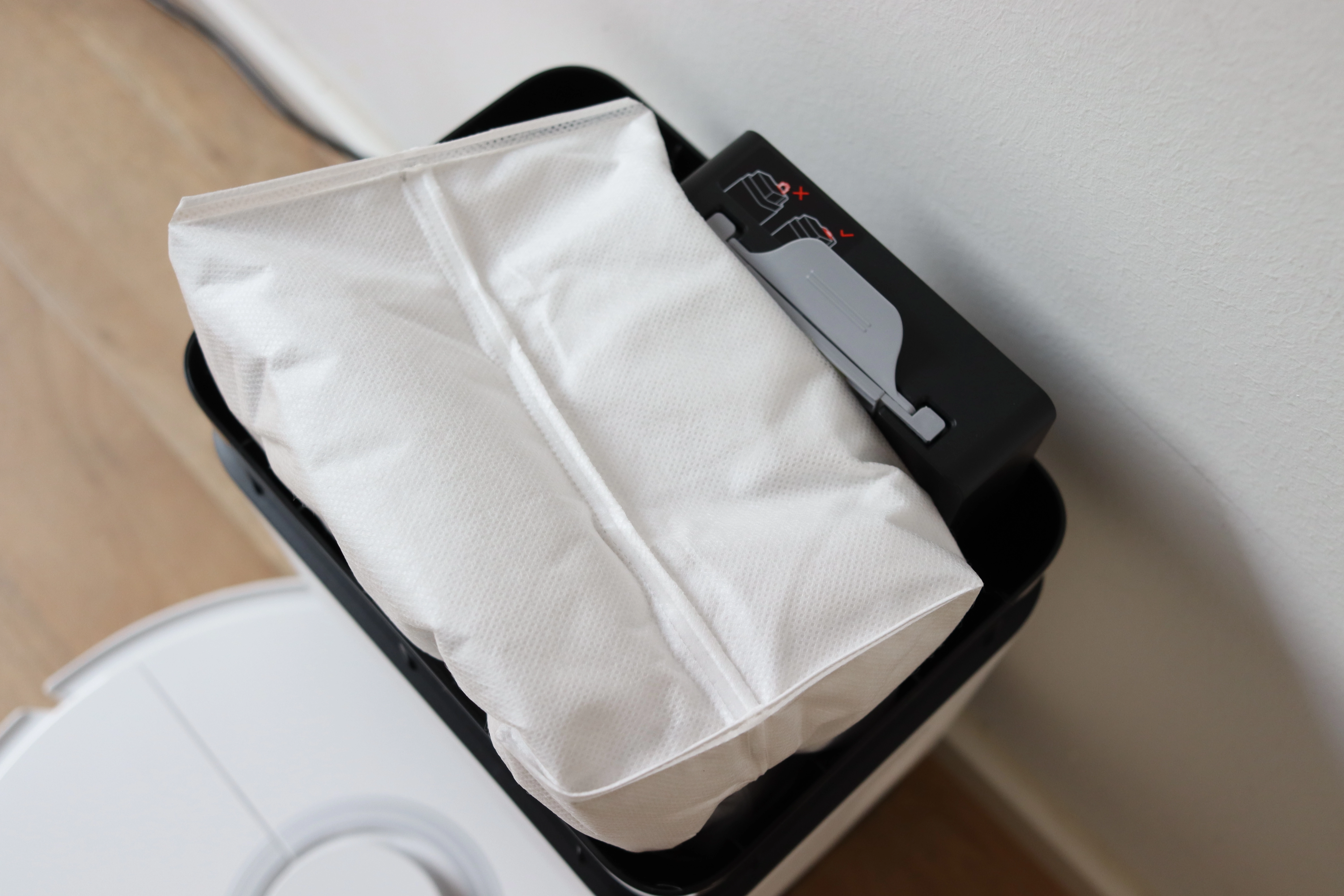 Habt ihr die Plus-Variante des Q7 Max gekauft, dann gibt es natürlich neben der Absaugstation auch noch einen weiteren Staubbeutel dazu. Hier erwartet uns aber erstmal eine Überraschung, denn hier verwendet man andere Staubbeutel als noch beim S7. Größter Unterschied ist wohl der Pappschuber, welcher hier durch einen Kunststoffhalter ersetzt wurde. Man schmeißt jetzt also mit jedem Staubbeutel auch ein Stück Plastik weg. Klar ist dieser so robuster, aber ein wenig Verschwendung ist es auch.