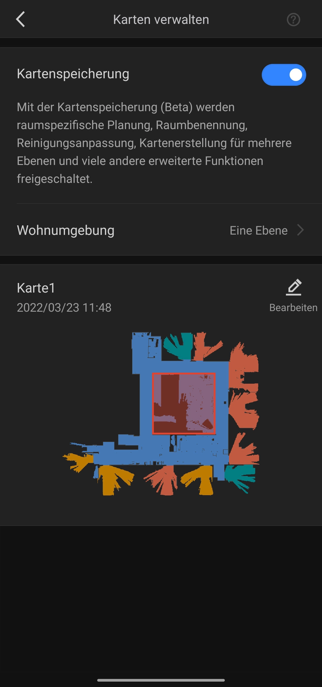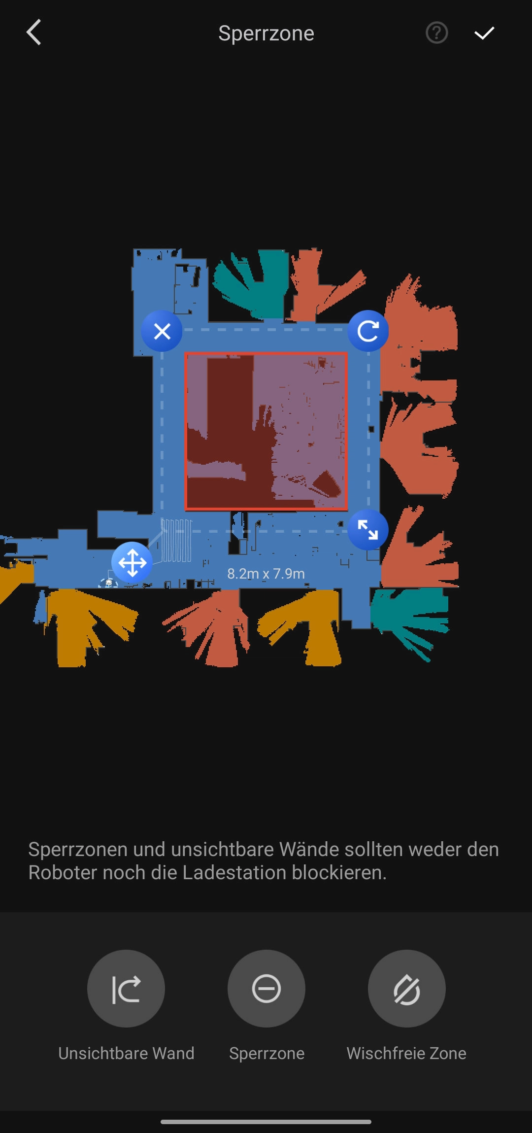 Jeder der schon einmal einen Saugroboter mit App-Steuerung hatte, wird hier nicht allzu überrascht über den Funktionsumfang sein. Zuerst möchte der Q7 Max einmal durch eure Wohnung fahren, um eine Karte zu erstellen. Das geht hier sehr zügig und innerhalb einer halben Stunde hat der Saugroboter unsere 105 m² Fläche Büro eingescannt. Gleichzeitig teilt er die abgefahrene Strecke in die einzelnen Räume ein. Wer noch nachjustieren muss, kann dies aber auch in der App tun. Mithilfe von virtuellen Wänden und Sperrzonen kann man dann auch noch die Karte bearbeiten, um problematische Ecken und Flächen abzuriegeln. Hat man mehrere Stöcke in seinem Zuhause, kann man verschiedene Karten für diese speichern.