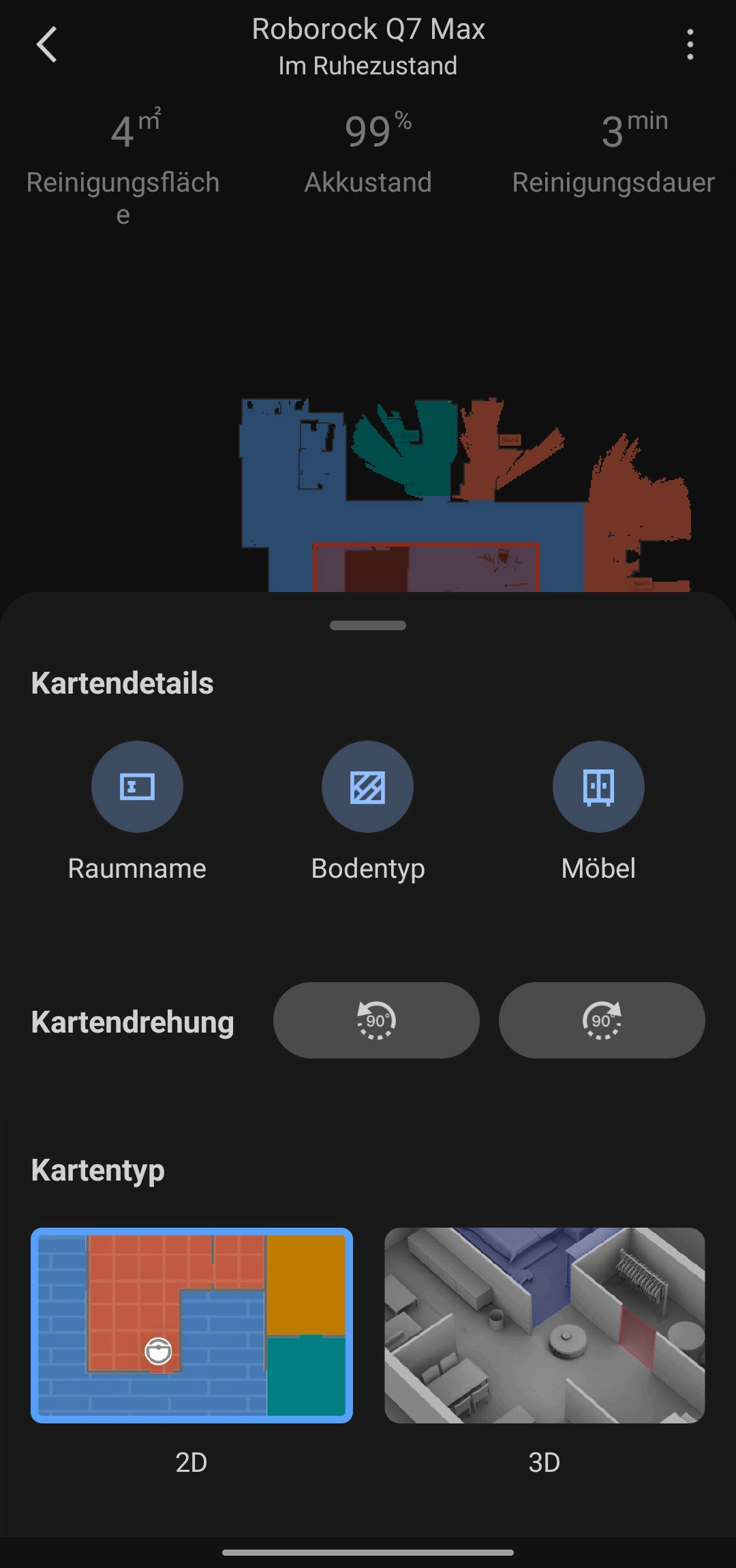 Statt der standardmäßig aktivierten 2D-Karte gibt es noch die 3D-Ansicht. Dort sieht man einen dreidimensionalen Umriss der Umgebung und kann virtuelle Möbel dort hineinstellen. Die Möbel an sich bringen schon etwas, da man so den Roborock Q7 Max anweisen kann bei diesen zu reinigen. Vielleicht geht es nur mir persönlich so, aber die 3D-Karte hingegen finde ich weniger übersichtlich und ziemlich nutzlos. Wie seht ihr das?