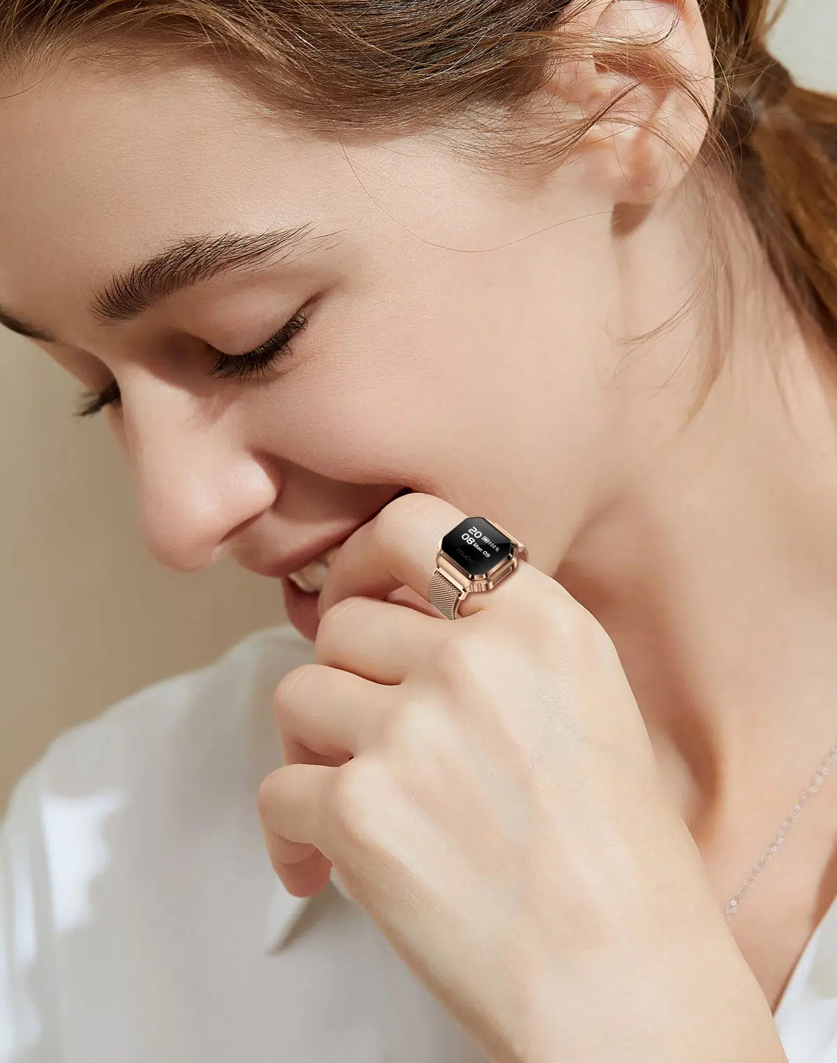 Laut Hersteller sorgt der Metallrahmen für eine gewisse Robustheit, welche man mit einem Milaniase-Armband auch optisch unterstreicht. Das hat hat einen magnetischen Verschluss, welcher sich individuell an deinen Finger anpasst. Das ist tatsächlich ein großer Vorteil gegenüber smarten Ringen, bei denen man sich im Vorhinein für eine Größe entscheiden muss. Anscheinend gibt es aber auch ein Armband für die Rogbid Fusion, so dass man die Uhr nicht zwingend als Smart Ring tragen muss, sondern es auch als Smartwatch nutzen kann.