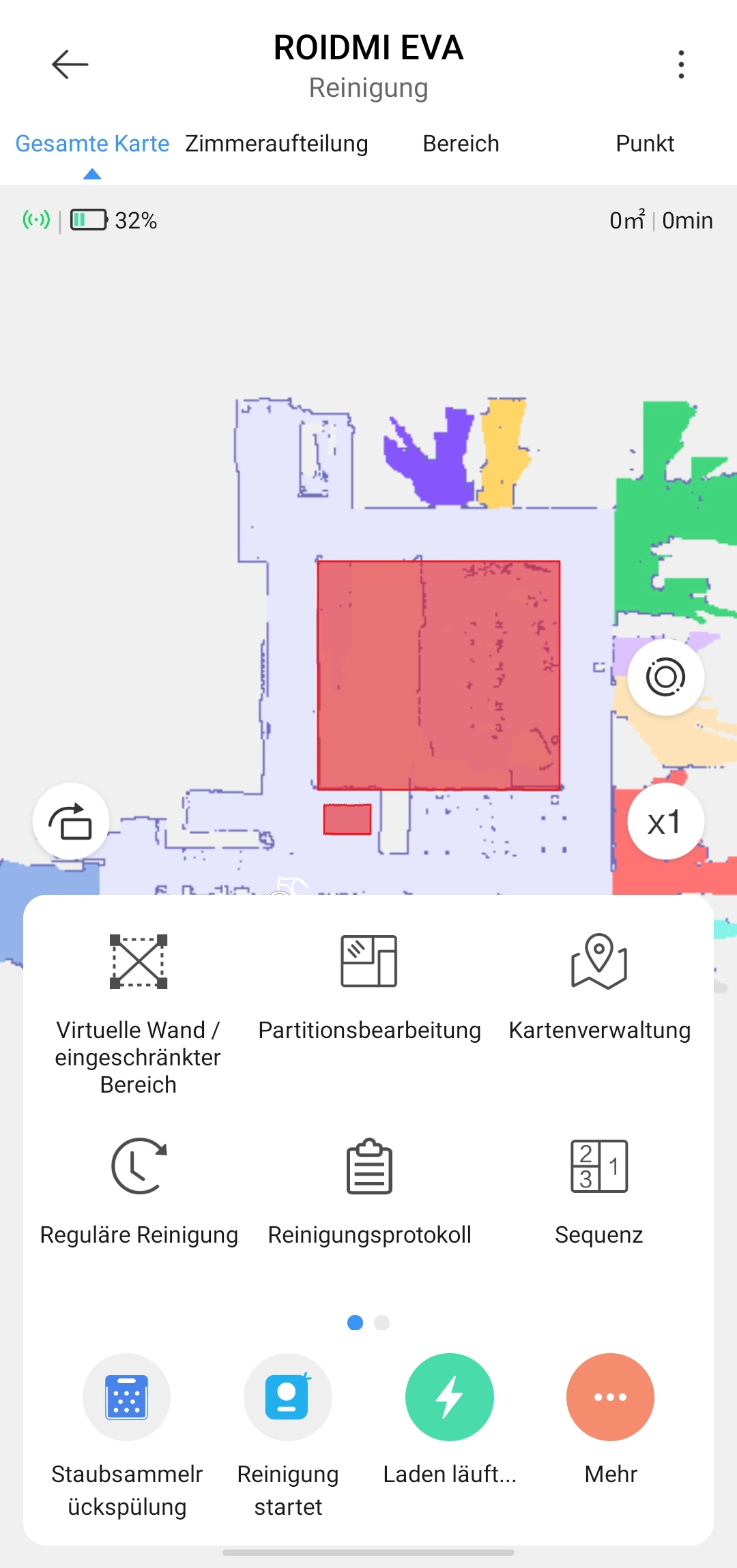 ROIDMI gibt eine Abdeckung von bis zu 200 m² Fläche an. In meinem Test kamen wir im Büro auf 150 m² bei voller Akkuladung, jedoch muss die Zahl von ROIDMI nicht unbedingt falsch sein. Stellt man die Reinigung der Wischmopps auf 12 Minuten, dann verringert man natürlich auch die Wege, die der Saugroboter erneut zurückfahren muss. So kann man deutlich mehr Fläche abfahren. Aber selbst wenn eure Etage so groß ist, kann der ROIDMI auch laden gehen und danach die Reinigung fortsetzen, dann muss aber auch der Wassertank komplett vor der Reinigung gefüllt sein. Für die Reinigung einer 100 m² großen Fläche brauchte der EVA eine Stunde und 30 Minuten.