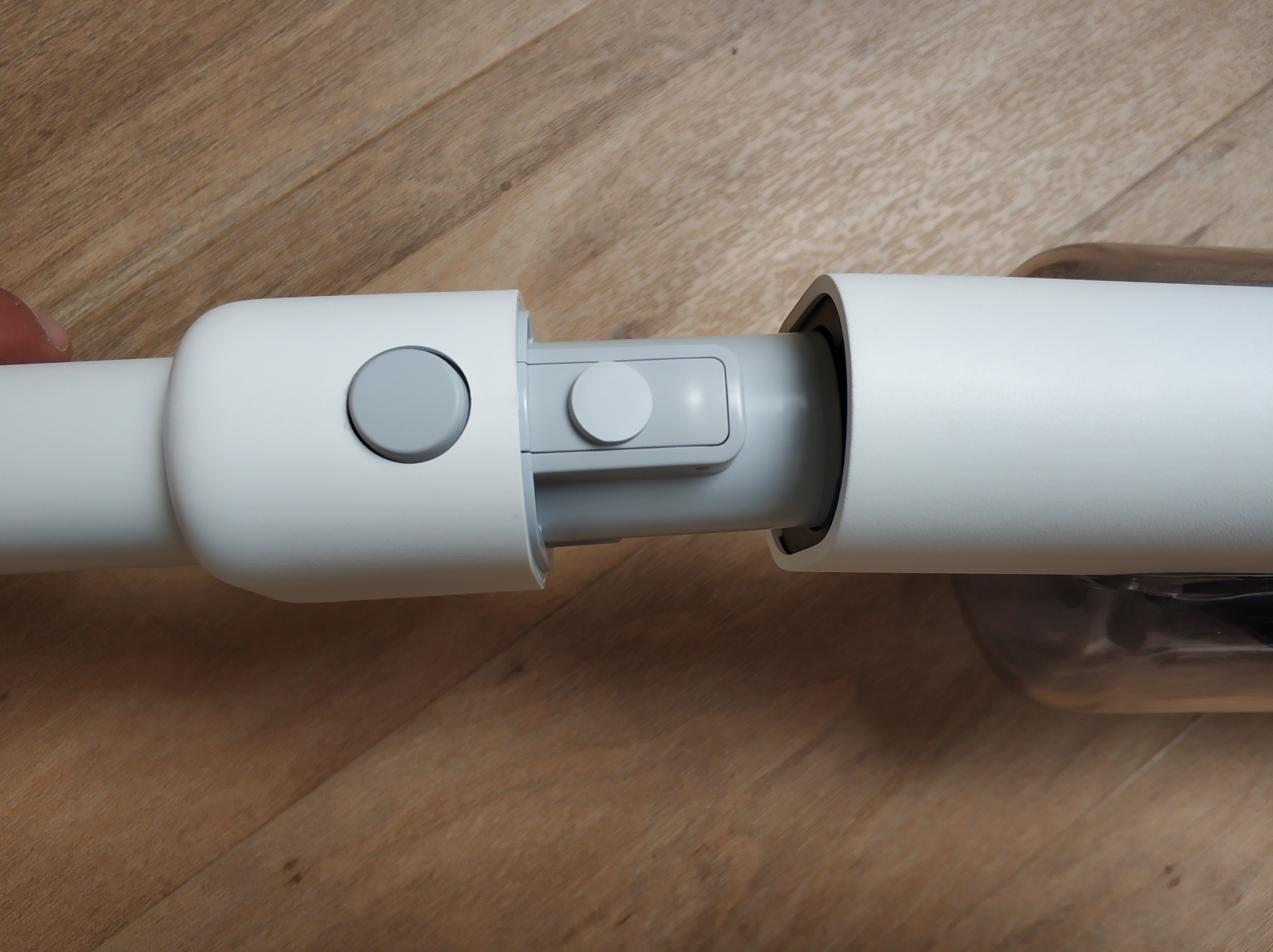 Das Prinzip hinter dem gleichzeitigen Wischen und Saugen funktioniert folgendermaßen: Man baut an die Bodendüse ergänzend einen weiteren Aufsatz mit 0,18 l Wassertank, der es ermöglicht, den Akkustaubsauger als Wischmopp zu verwenden. Gehalten wird der Tank mit Magneten. Die Bodendüse, worüber der Staub eingesaugt wird, bleibt aber dran. Entsprechend saugt und wischt der Roidmi NEX zeitgleich. Das Anbringen des Wischaufsatzes über die Magneten ist mal richtig cool, seht selbst: